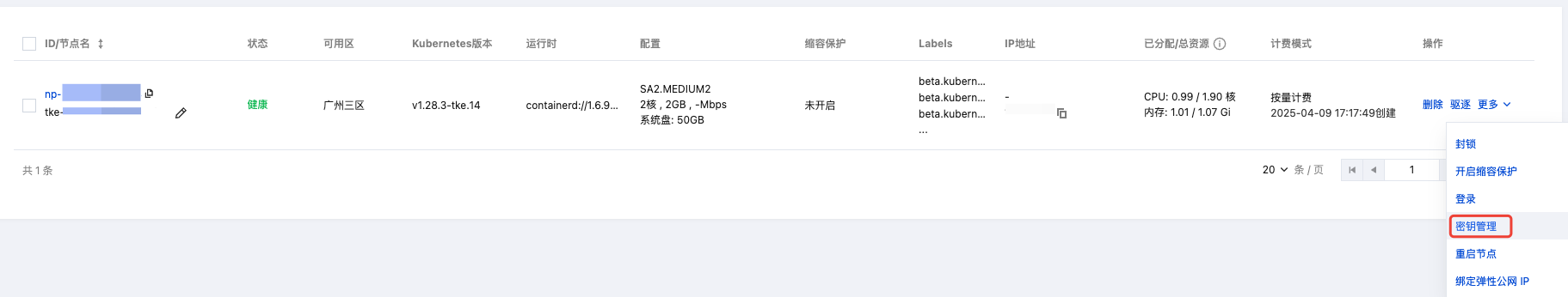 4. 在节点池节点列表页中,选择节点所在行右侧的更多 > 密钥管理。如下图所示: