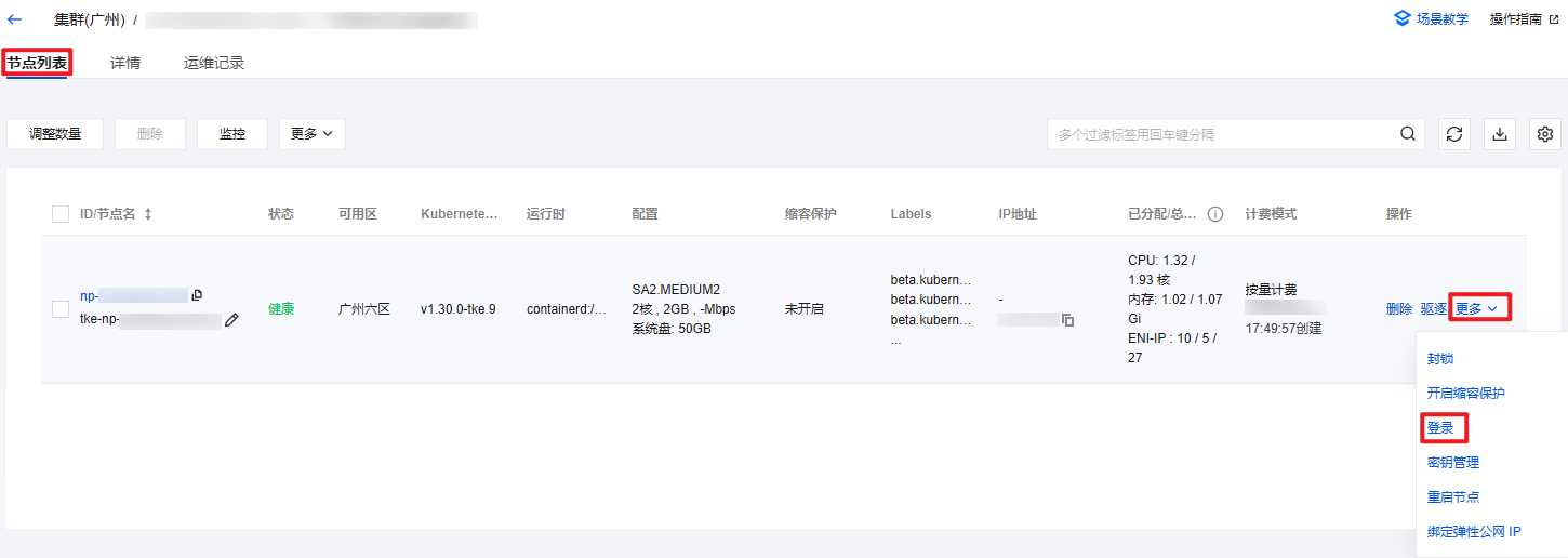 5. 在节点池节点列表页中,选择节点所在行右侧的更多 > 登录。如下图所示: