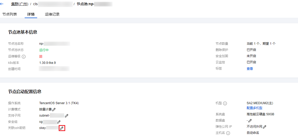 4. 在节点池详情页中,单击节点启动配置信息中关联 ssh 密钥右侧的