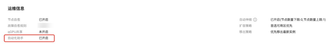 4. 在节点池的详情页,运维信息下的自动化助手确保是已开启的状态。