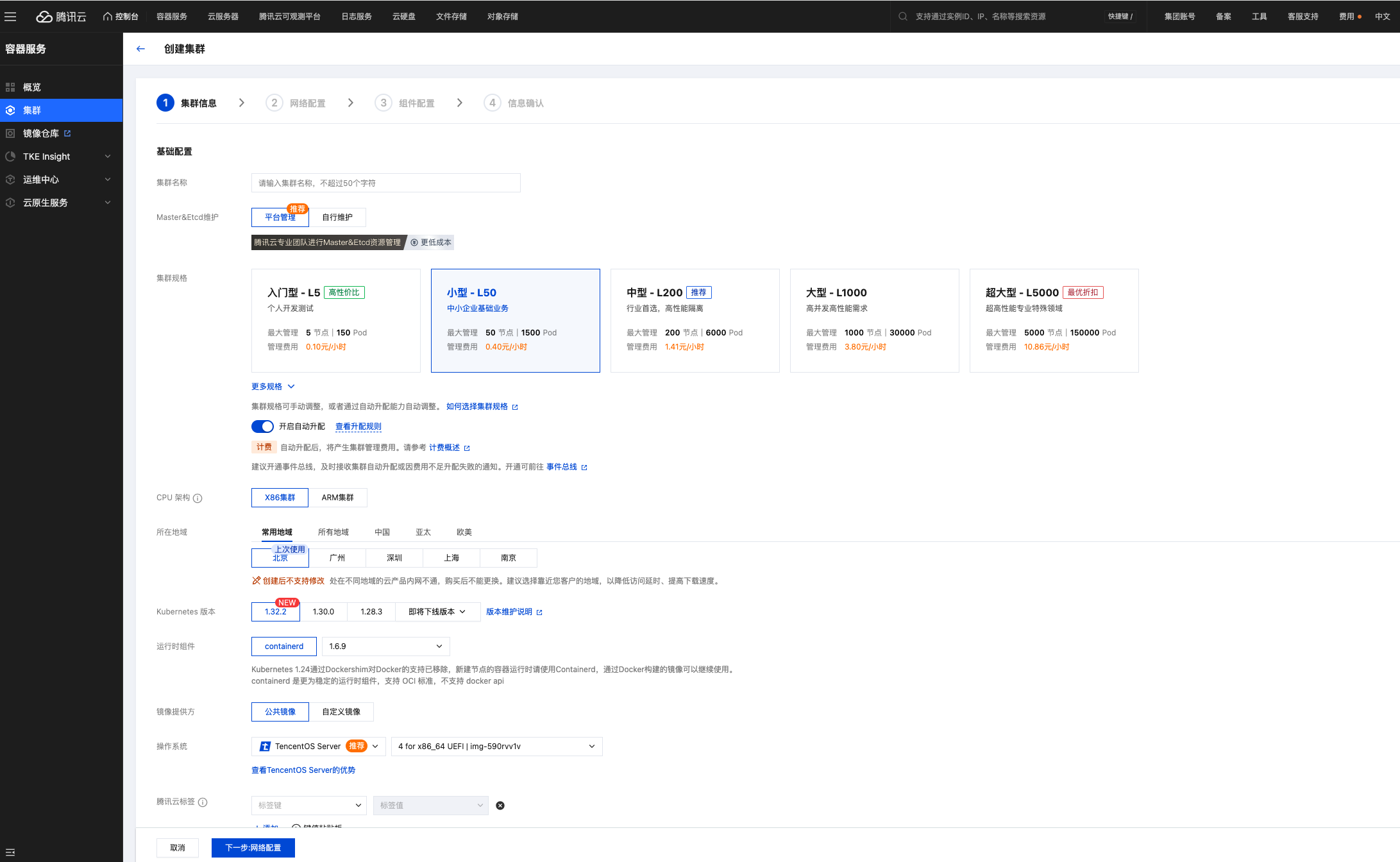1. 开通并创建 TKE 集群,操作步骤详情可参见 创建容器服务集群。在创建集群时,Kubernetes 版本选择最新的1.32.2,容器网络插件选择 Global Router,其他选项默认即可。