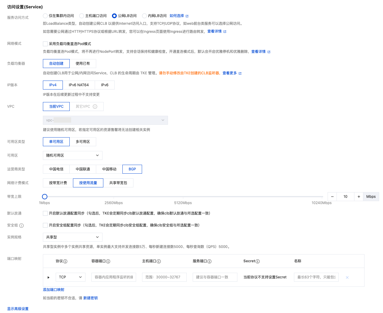 9. 创建 Deployment 对应的 Service,并选择公网 LB 访问,对外暴露7860端口访问。