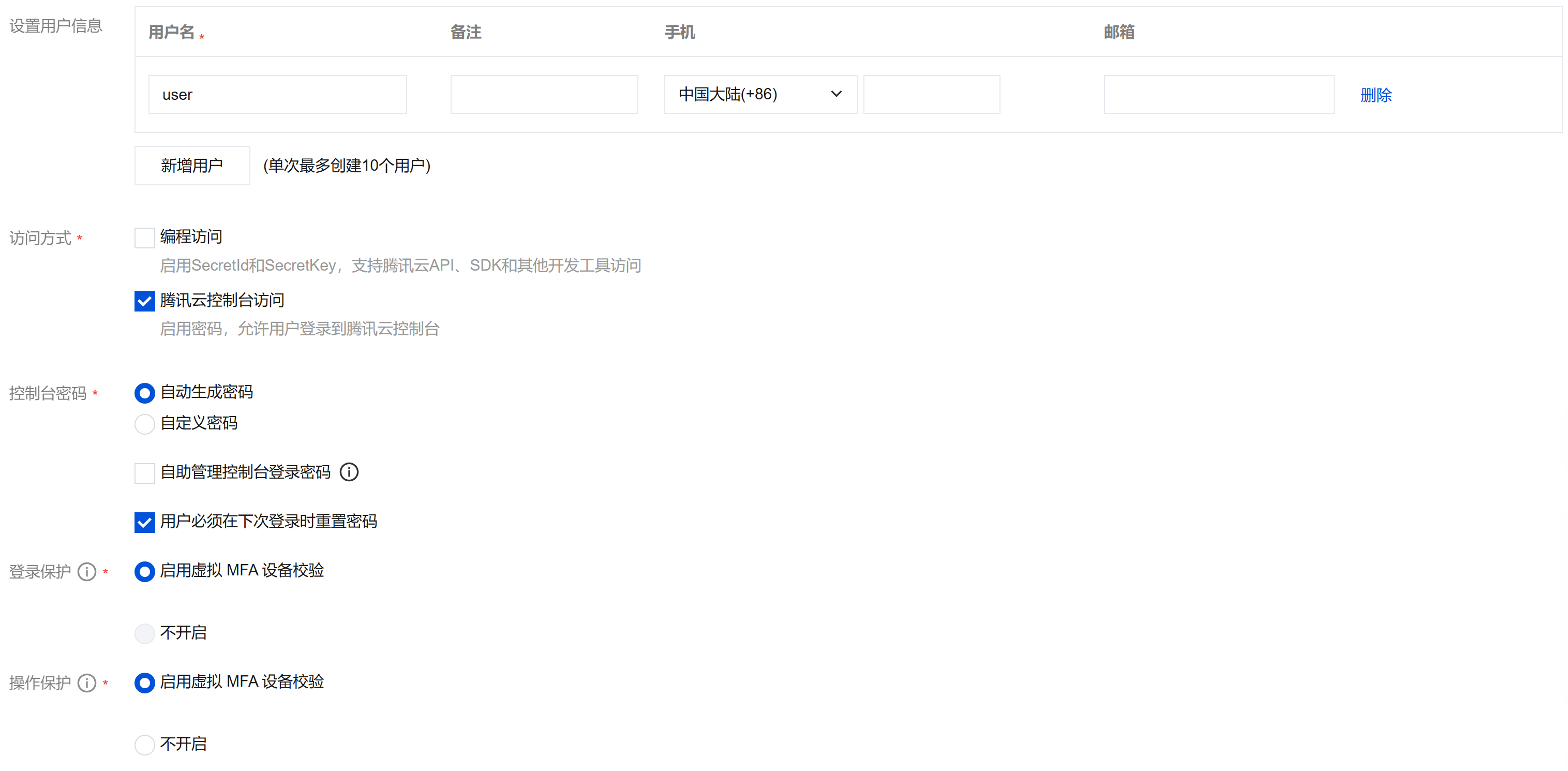 5. 填写用户信息。在此过程中,可批量创建子用户,设置访问类型和控制台的登录密码等,如下图所示。