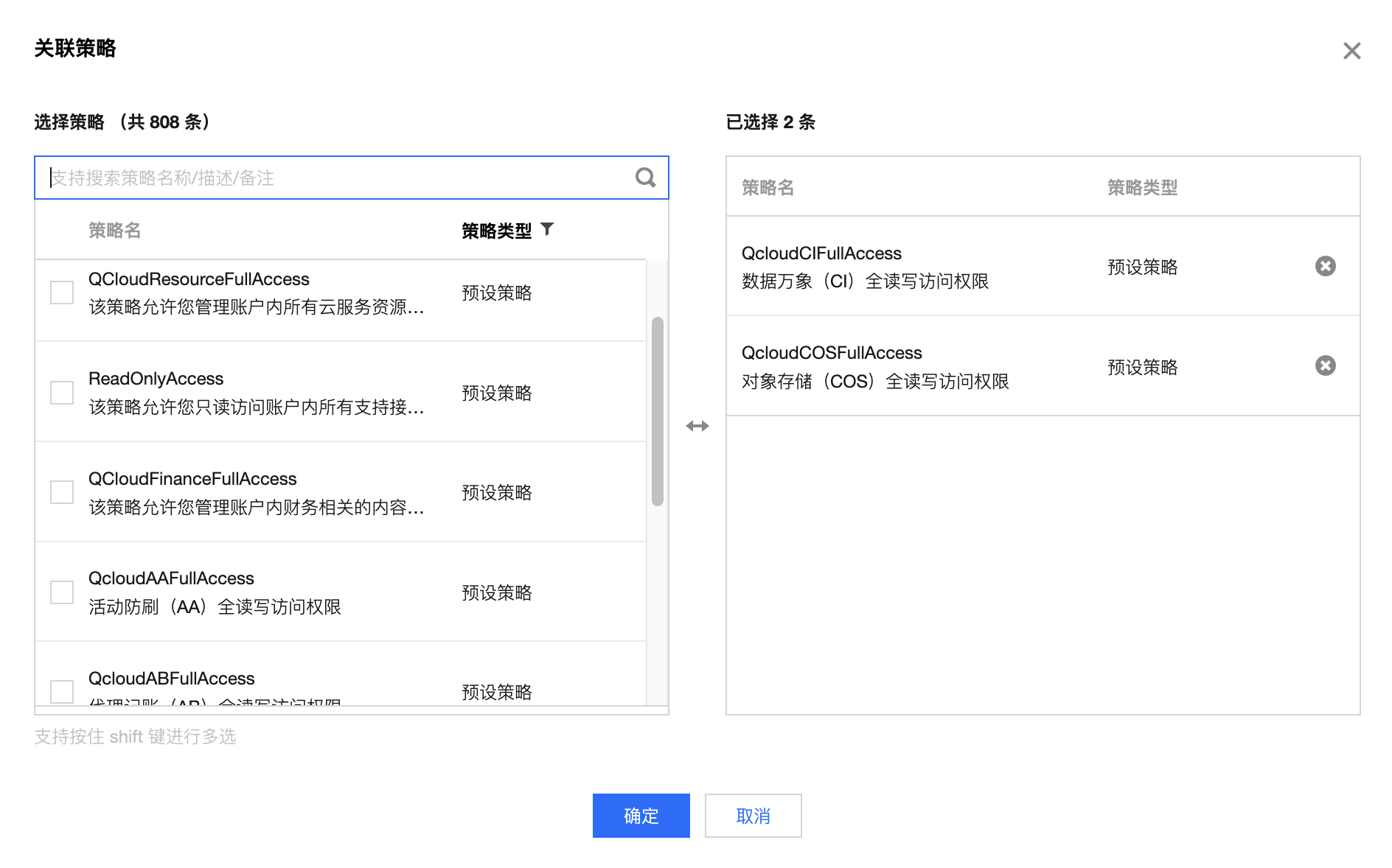 3. 为子账号配置数据万象的操作权限时,必须同时开通 COS 资源读写权限和 CI 资源读写权限。在列表中勾选需要授权的策略,然后单击确定,即可完成为子用户授权关联策略操作。如下图所示: