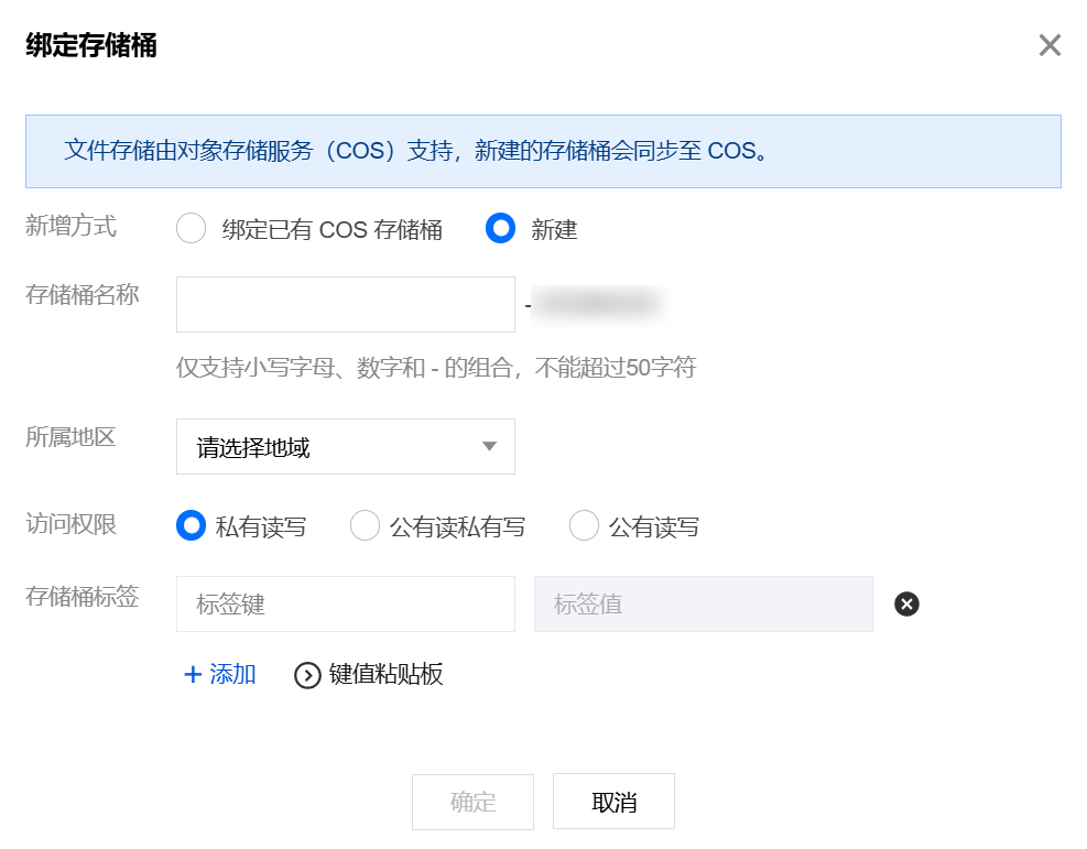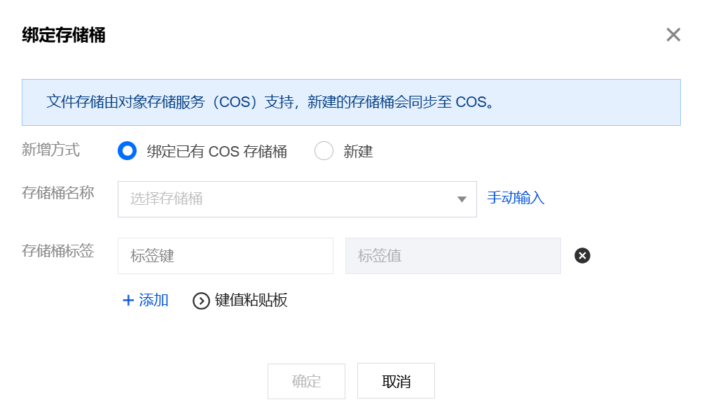 3. 单击绑定存储桶,在弹出的窗口中,选择绑定已有 COS 存储桶,并按照存储桶格式输入存储桶名称。