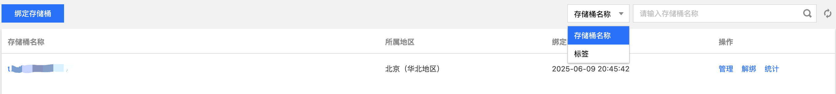 若您需要对数据万象已绑定或新增的存储桶进行查询操作,可通过右侧的下拉框选择通过存储桶名称或存储桶标签进行筛选。
