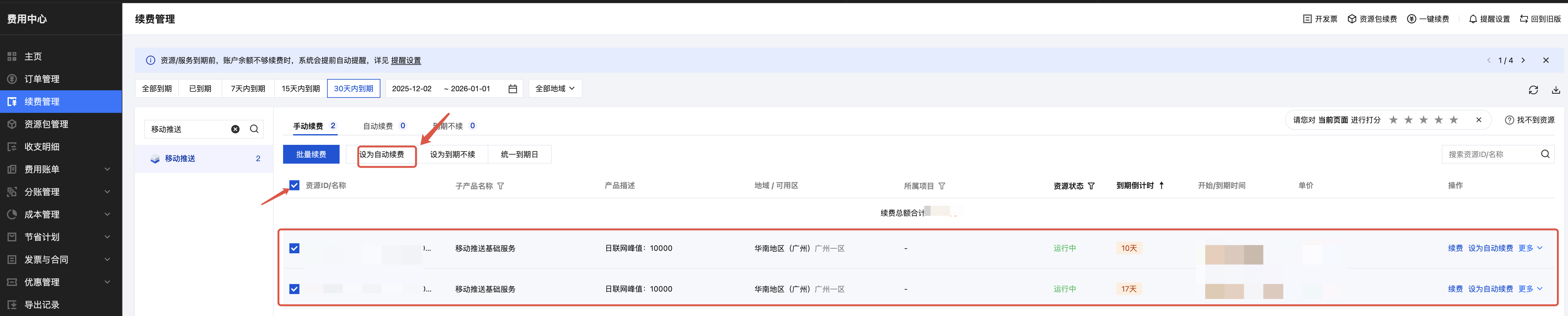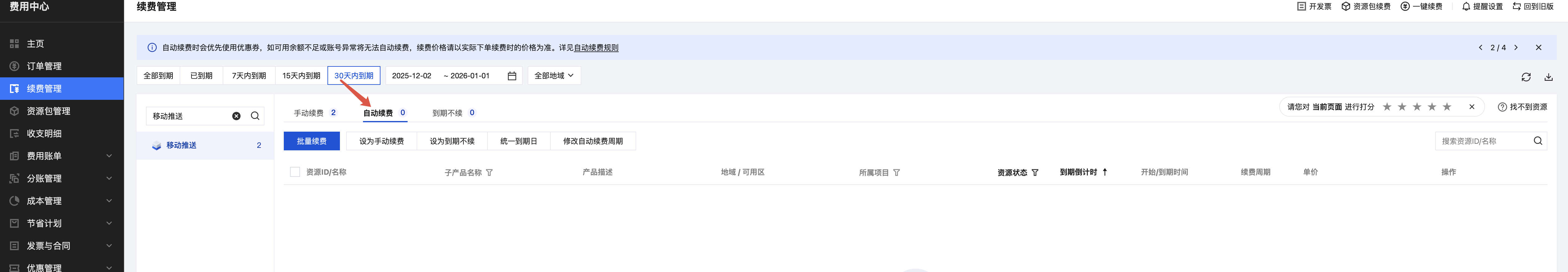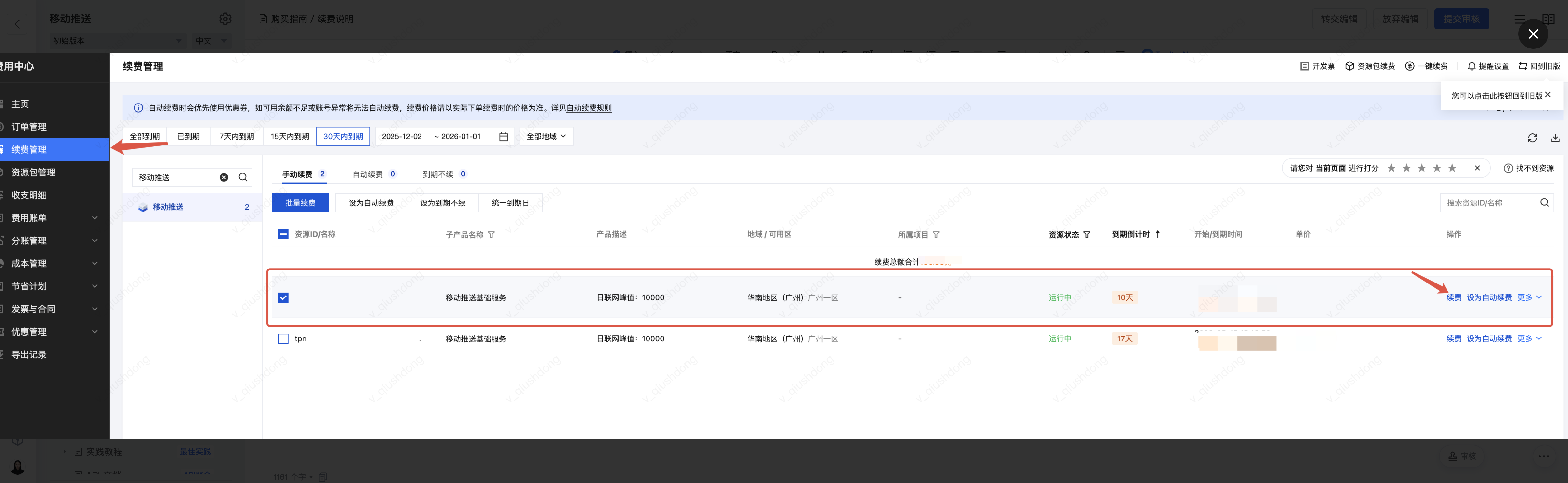 移动推送资源包到期前7天至到期前1天,系统每天会给您发送资源到期提醒,请及时在控制台进行 续费。