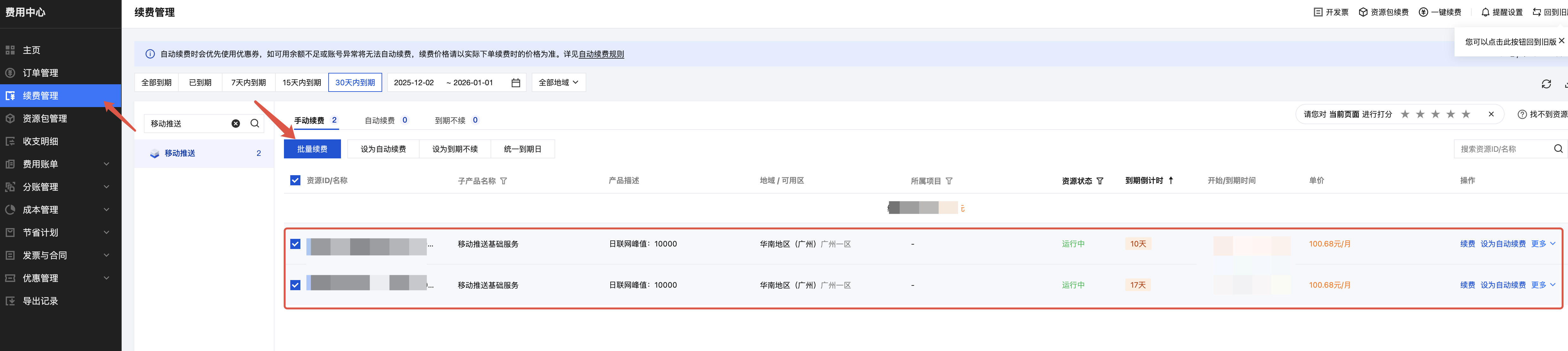 勾选多条需要续费的资源,单击批量续费,统一或按条设置时长,核对金额与代金券,提交支付。