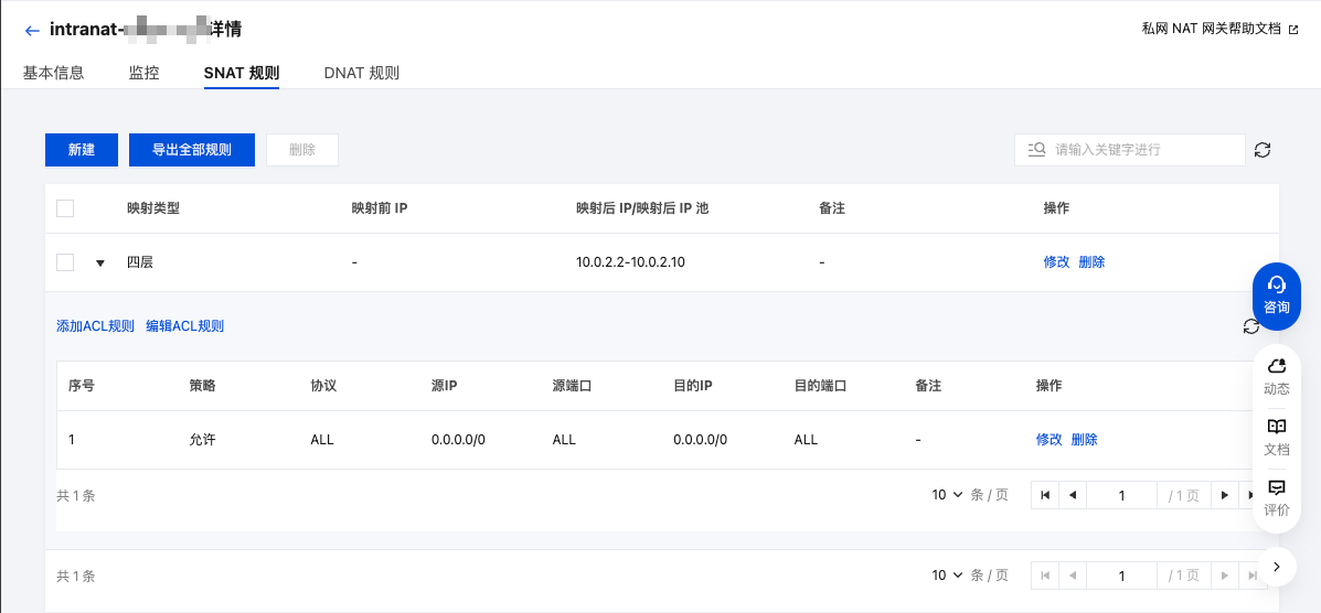 2. 在 SNAT 规则和 DNAT 规则页签配置 SNAT 和 DNAT 规则,本例以 SNAT 为例。