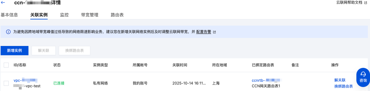 1.3 在 CCN 实例详情页面单击关联实例页签,单击新增实例,在关联实例对话框选择用户业务 VPC 以及上述已创建的 CCN 网关路由表 1,单击确定,即为当前路由表绑定用户业务 VPC。