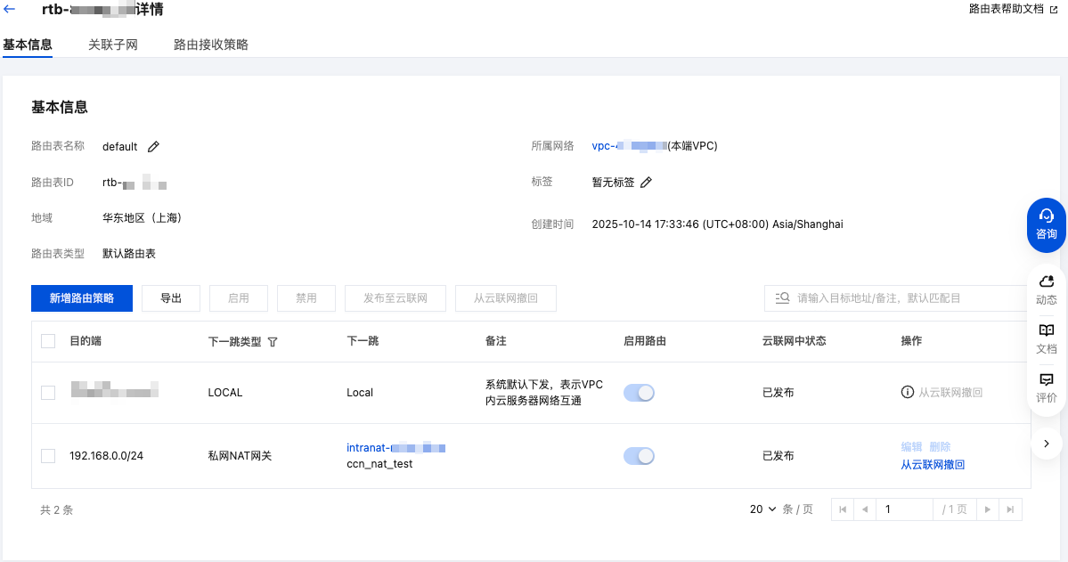 4.4 参考上述操作,在对端 VPC 默认路由表中添加路由策略,配置目的端为上述已创建的 NAT 规则映射后的 IP 路由、下一跳为私网 NAT 网关的路由策略,配置完成后单击发布到云联网。