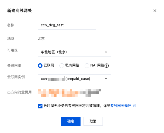 并将该专线网关关联到云联网多路由表中。3.1 登录 专线网关控制台,选择地域和私有网络后,单击新建。输入名称并选择可用区,关联上述已创建的云联网实例,单击确定,完成云联网型专线网关的创建。