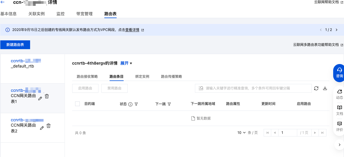 1.2 在云联网实例页面,单击上述步骤中创建好的云联网 ID,在云联网实例详情页,单击路由表页签,在路由表页签单击新建路由表,创建两个路由表,即 CCN 网关路由表1和 CCN 网关路由表2。