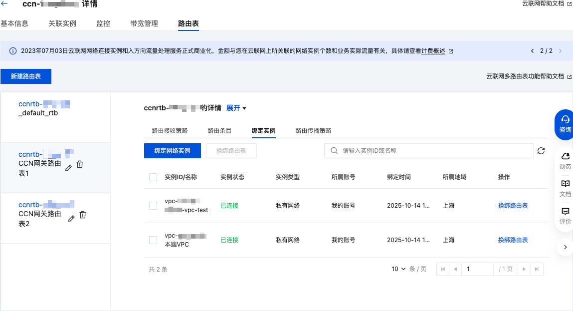 2.3 参考上述操作,将 NAT 实例的对端 VPC 绑定到已创建的 CCN 网关路由表2中。