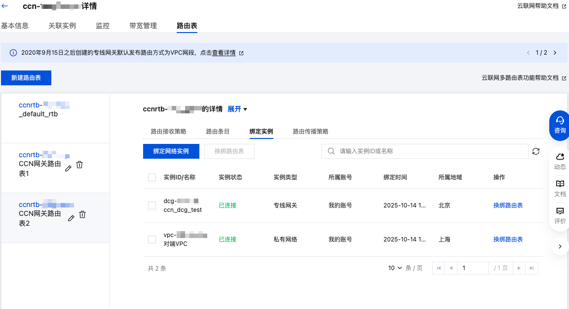 3.2 在 云联网控制台 找到上述已创建的 CCN 实例,并单击路由表页签,在绑定实例页签单击绑定网络实例,将专线网关加入 CCN 网关路由表2中。