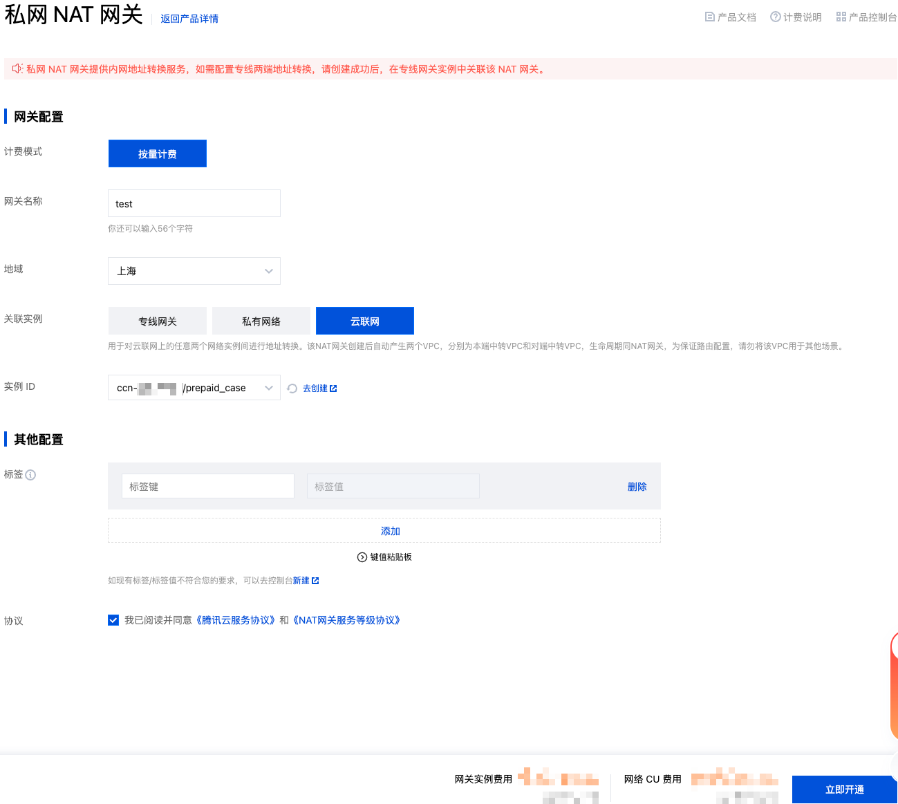 表中。2.1 登录 私网 NAT 网关控制台,在页面上方选择地域和私有网络后,单击立即开通,创建成功后得到云联网型私网 NAT 实例以及本端 VPC 和对端 VPC 实例。