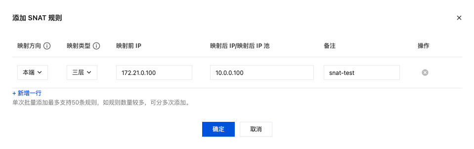 2. 在 SNAT 规则页签,单击新建,填入以下配置信息完成 SNAT 规则的新建。