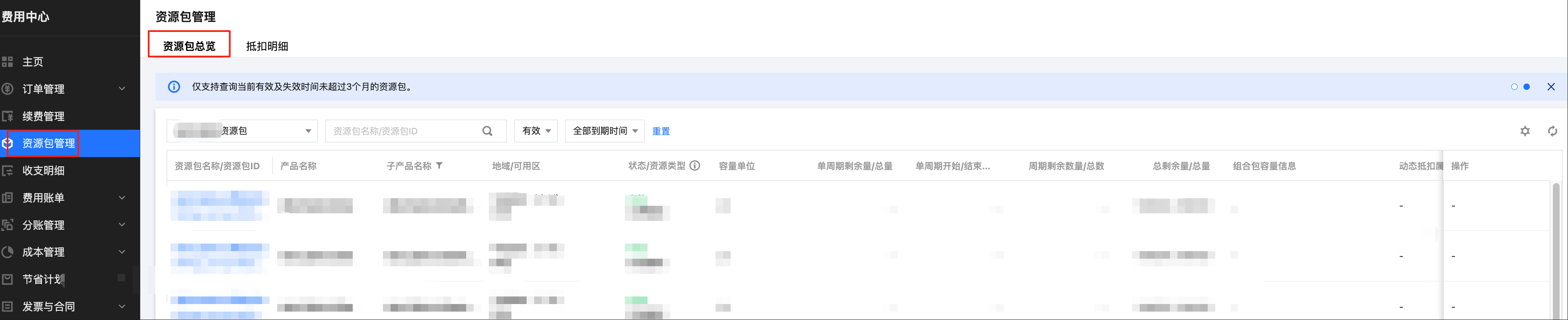 本页面支持您查看所购资源包现状(总量/剩余量/状态等)并进行相关操作(续费),以便您更好地管理名下资源包。