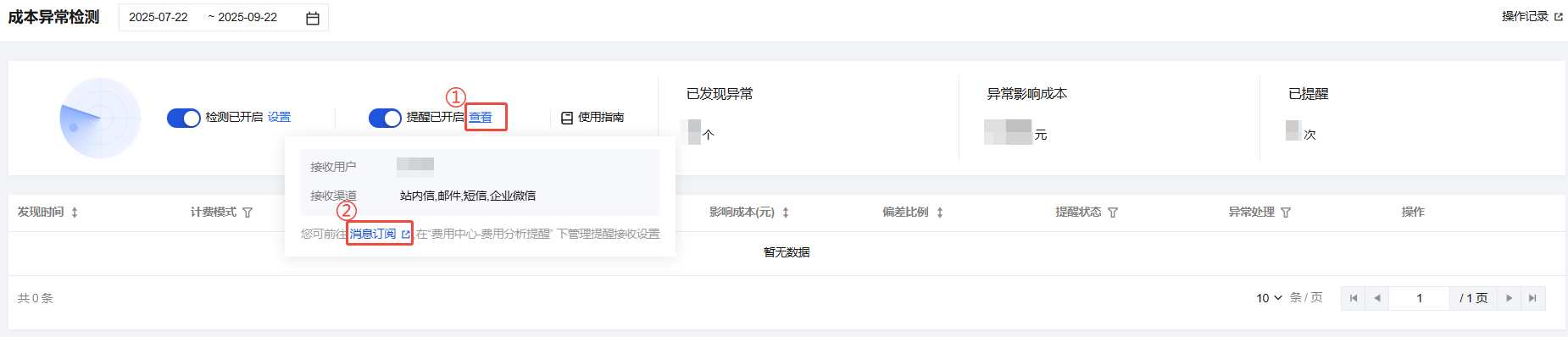 1. 您可以在 成本异常检测 页面,单击提醒已开启后方的设置/查看,单击消息订阅。