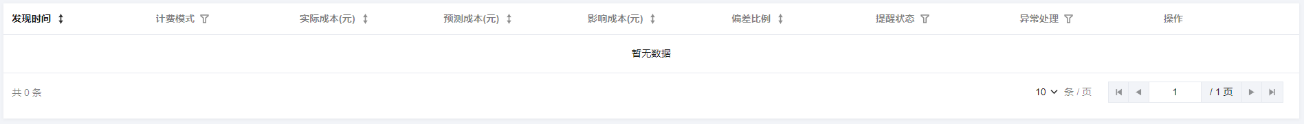 异常检测列表包含:发现时间、计费模式(按量计费、包年包月)、实际成本、预测成本、影响成本、偏差比例、提醒状态、异常处理、操作。