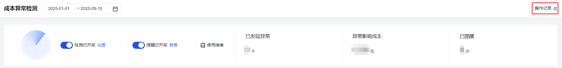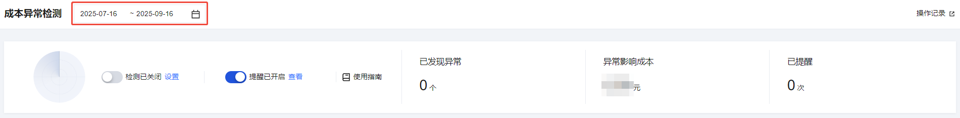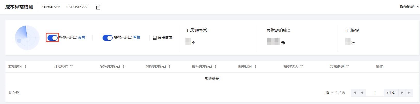 异常检测概览页面包含:异常检测、提醒设置、已发现异常、异常影响成本几个模块。支持查看检测开启/关闭状态,提醒开启/关闭状态,也支持根据需要进行设置开启或关闭。