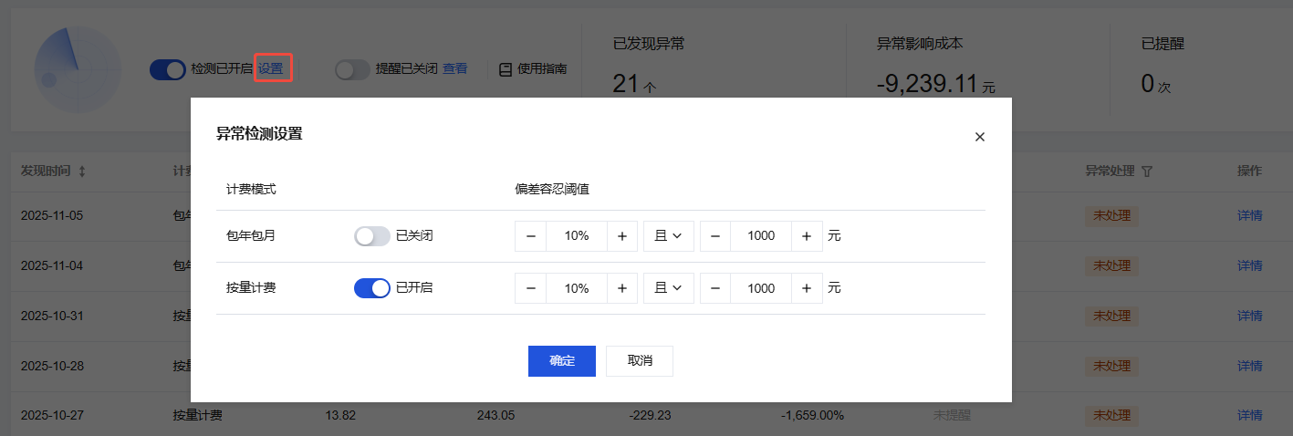 支持开启/关闭包年包月、按量计费异常检测和容忍阈值。