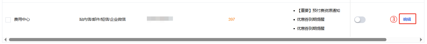 2. 在消息订阅页面找到费用中心单击编辑进行设置消息提醒接收人。