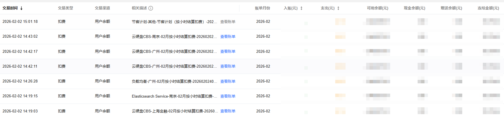 扣费类型:默认为全部,可选择预付费支付、按量小时结、按量日结、按量月结、调账扣费、其他扣费。
