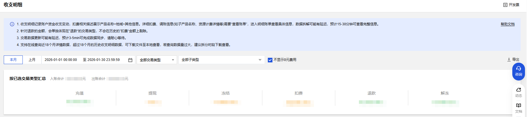 按已选交易类型汇总:汇总选定时间段内入账和出账总金额,及各项交易类型汇总金额。