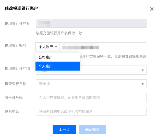 3. 对公汇款方式充值的金额提现,需要用户填写提现银行账户信息,其中提现银行开户名不可修改。请保证您的“提现银行账号”的属性(个人还是企业),与您腾讯云账号实名认证的性质一致(个人认证或企业认证)。如二者不一致,银行汇款时可能会出现失败。