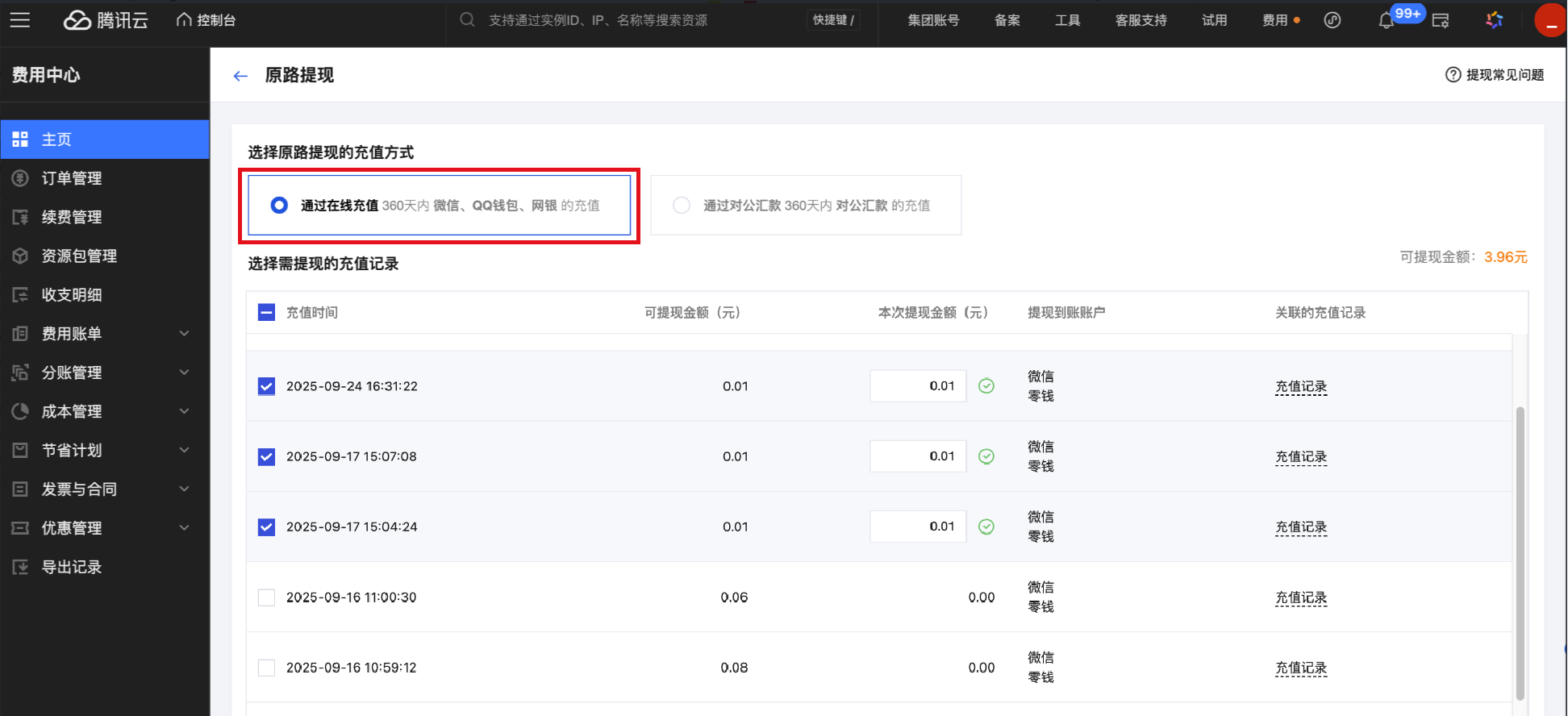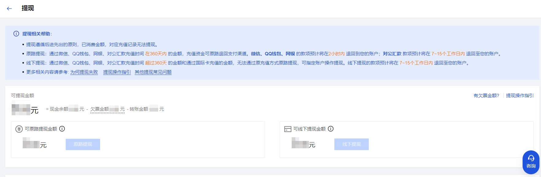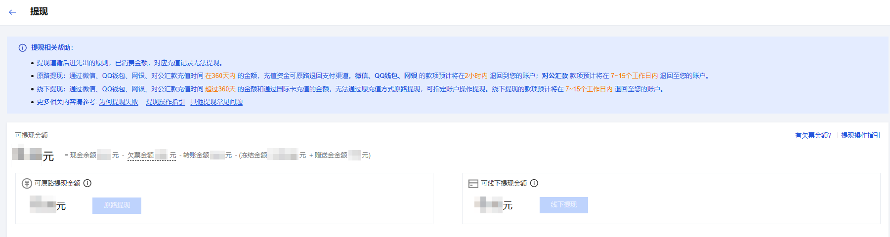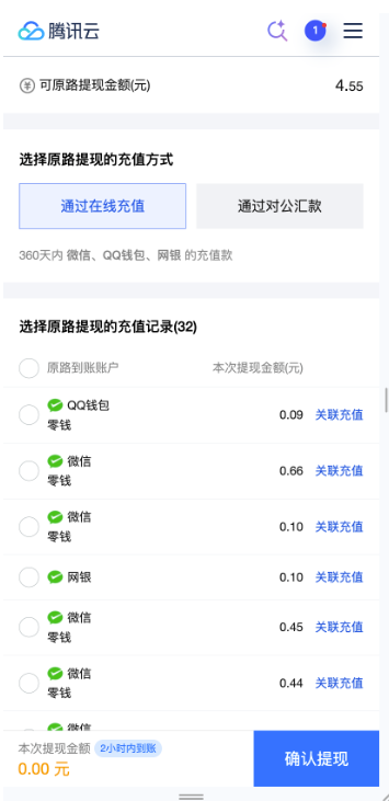 线上通过微信、QQ 钱包和网银充值的款项将在2小时内到账,线上国际卡和对公汇款的款项将在7 - 15个工作日内到账。您可以在控制台 提现 页面或腾讯云助手小程序费用中心进行提现操作,并于对应页面查询提现的状态。