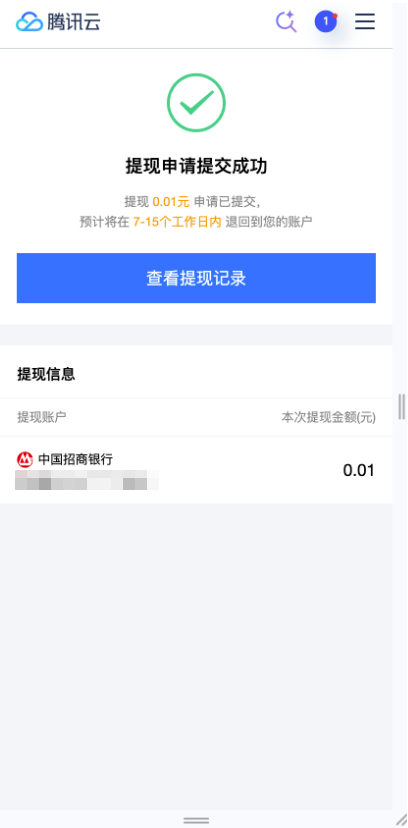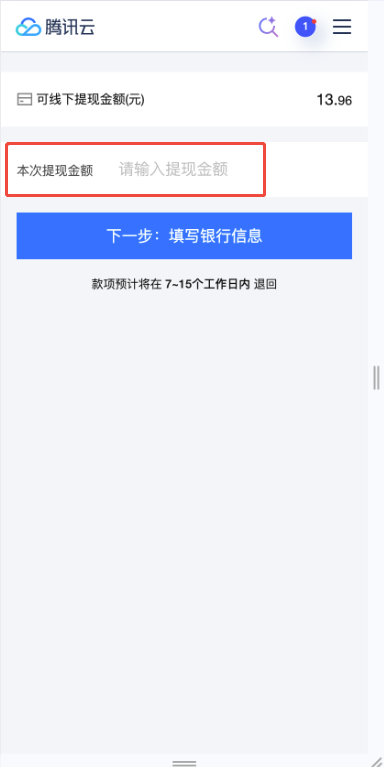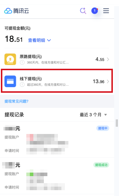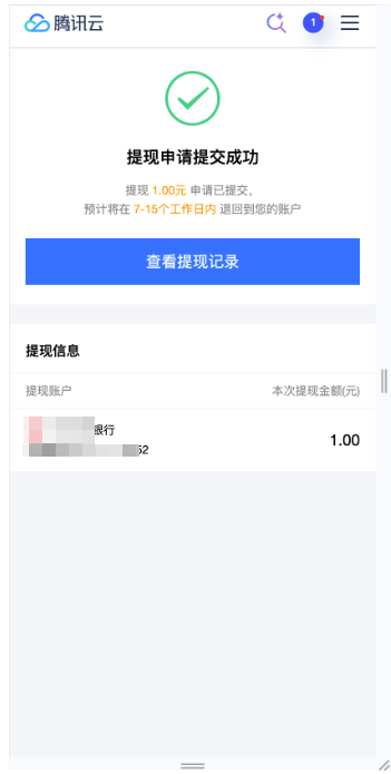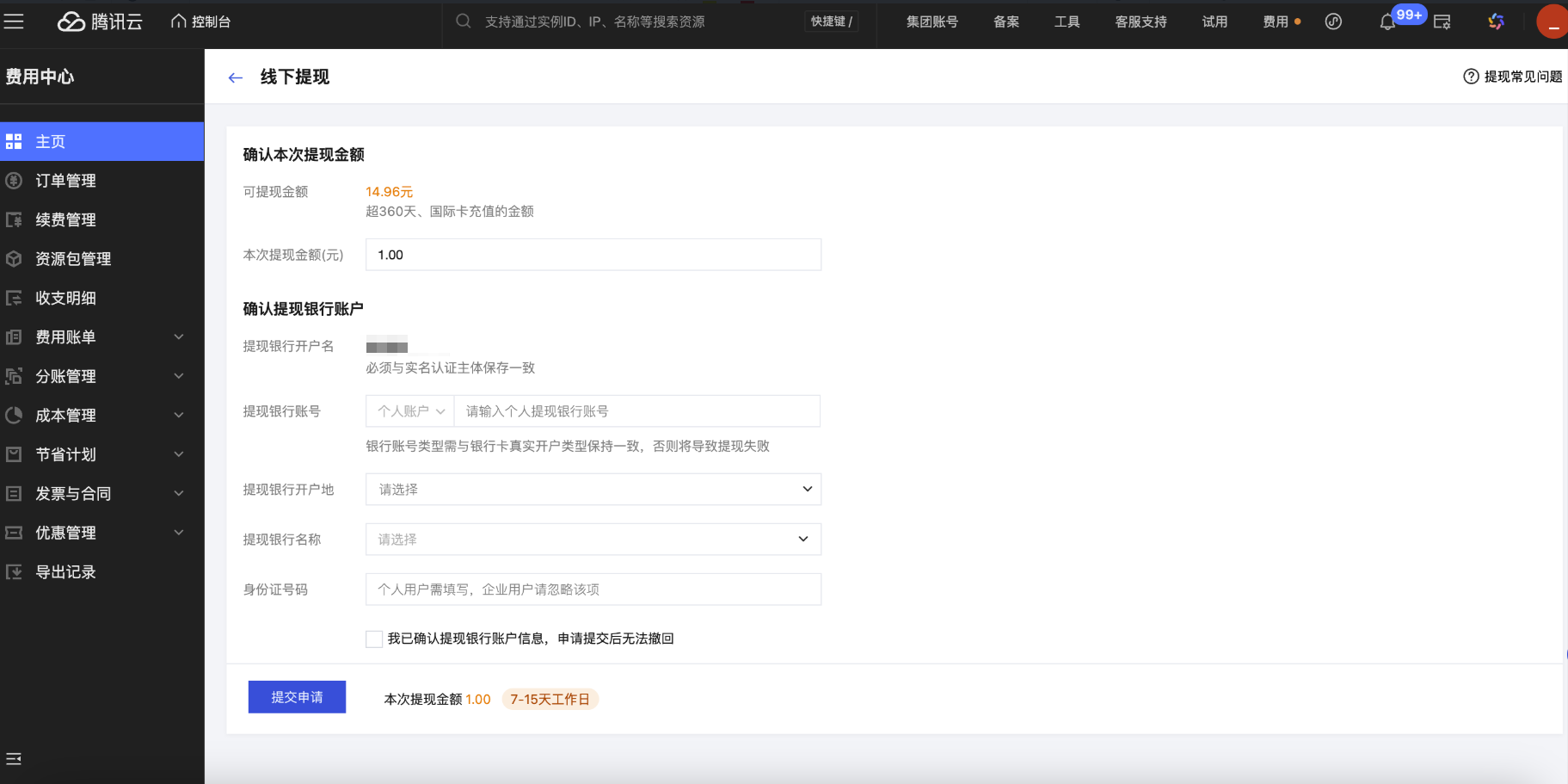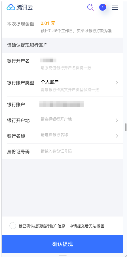填写提现收款的银行账户信息并确认提现。线下提现时银行开户名与实名认证主体一致,不可修改。另外请保证您的“提现银行账号”的属性(个人或者企业),与您腾讯云账号实名认证的性质一致(个人认证或企业认证)。如二者不一致,银行汇款时可能会出现失败。