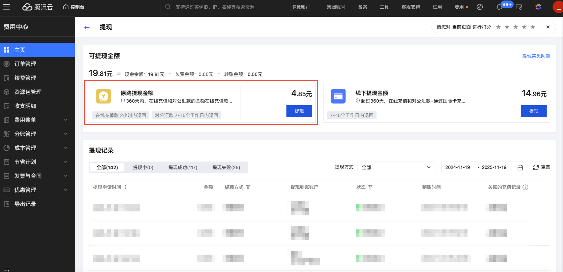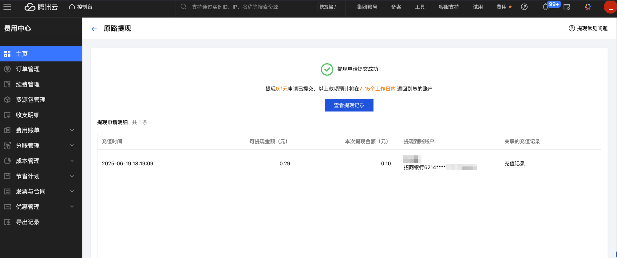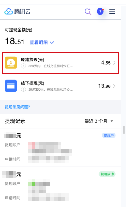 1. 登录腾讯云官网,进入费用中心 > 主页 > 提现 页面,单击原路提现中的按钮跳转到提现页面。