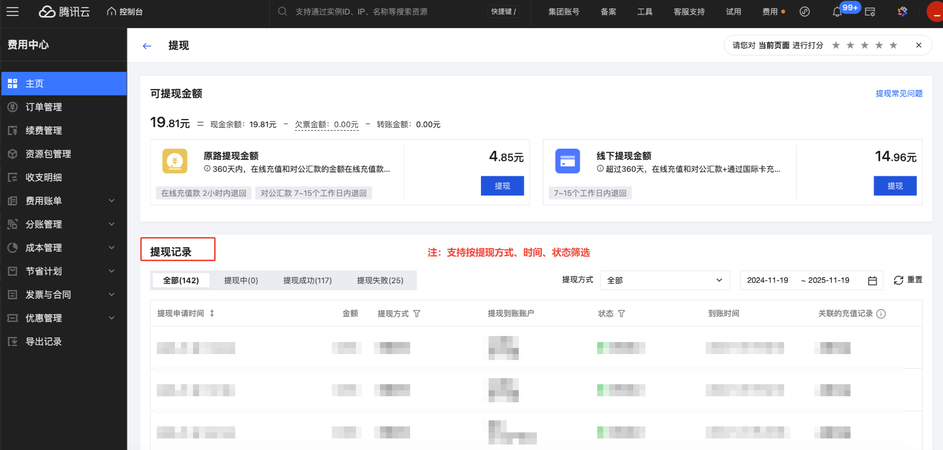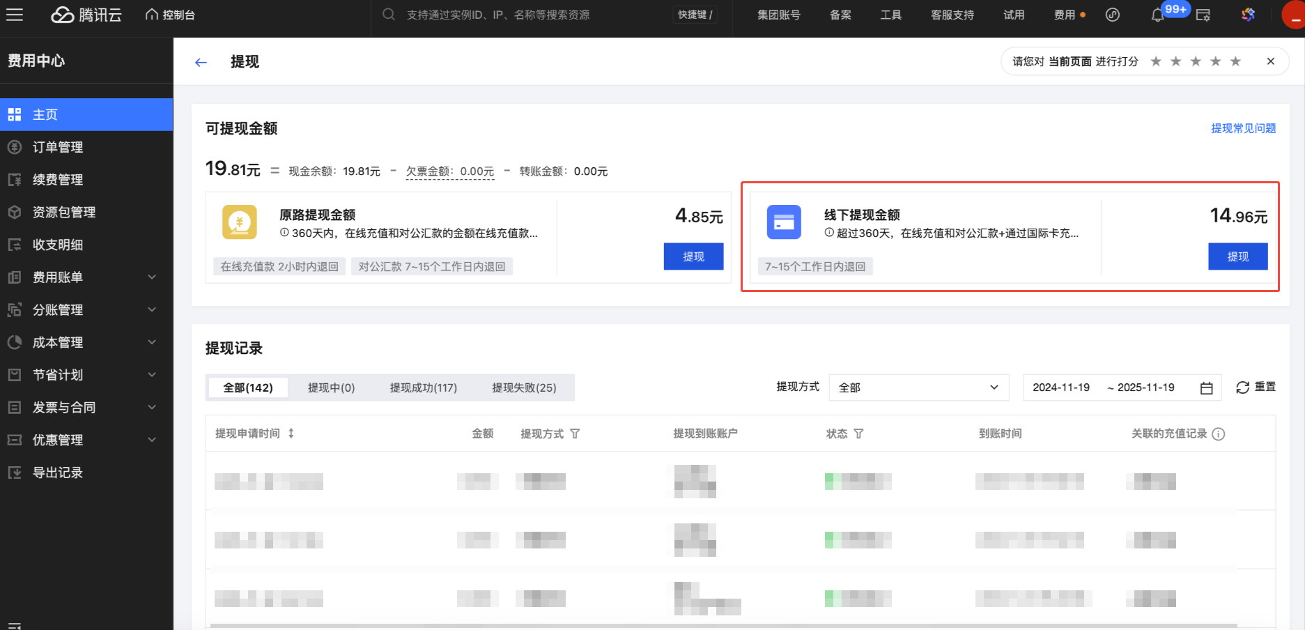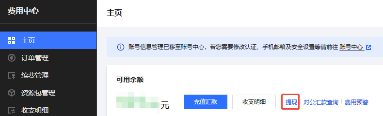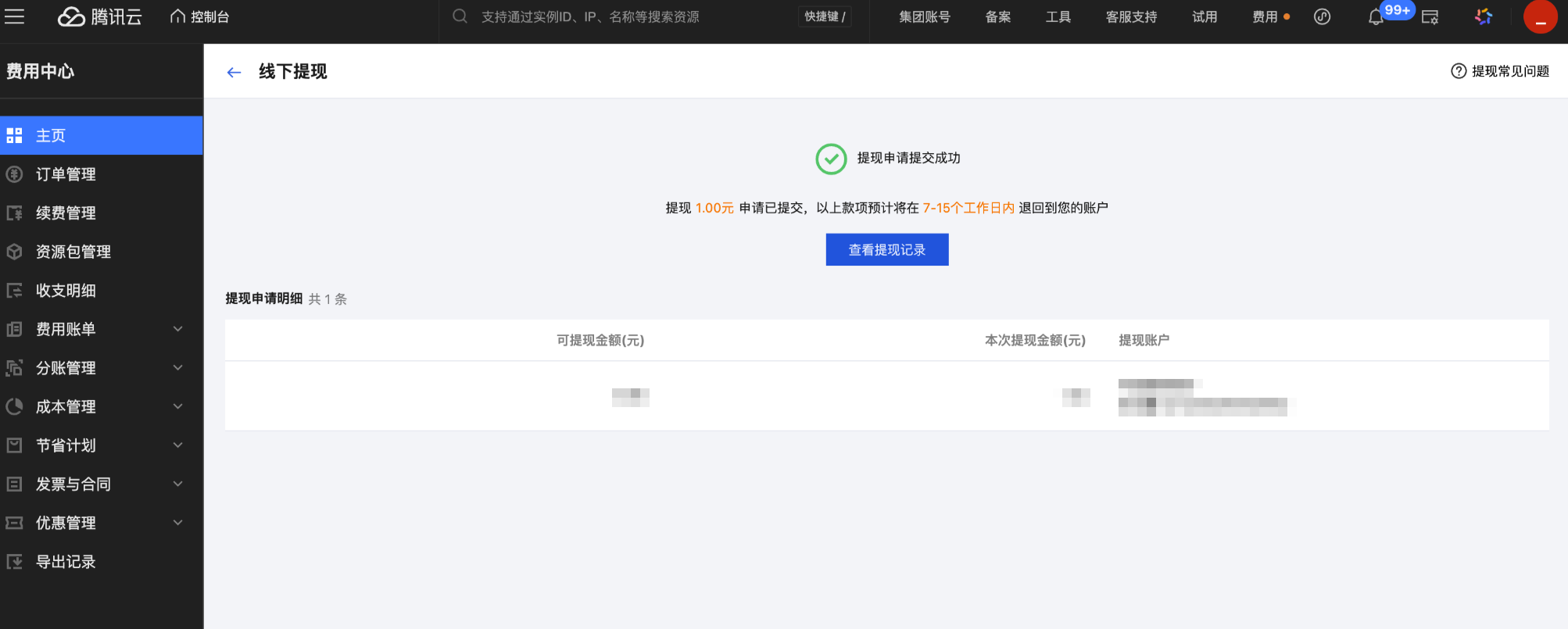 1. 登录腾讯云官网,进入费用中心 > 主页 > 提现 页面,申请线下提现。