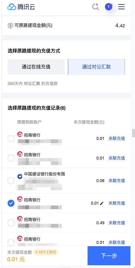 2. 选择原路提现的充值方式 > 通过对公汇款。勾选(单选一条)需要提现的对公汇款记录,在输入框中输入本次提现金额,每次可提取当前充值记录的部分或全部金额。确认金额无误后,单击下一步进行银行信息确认。