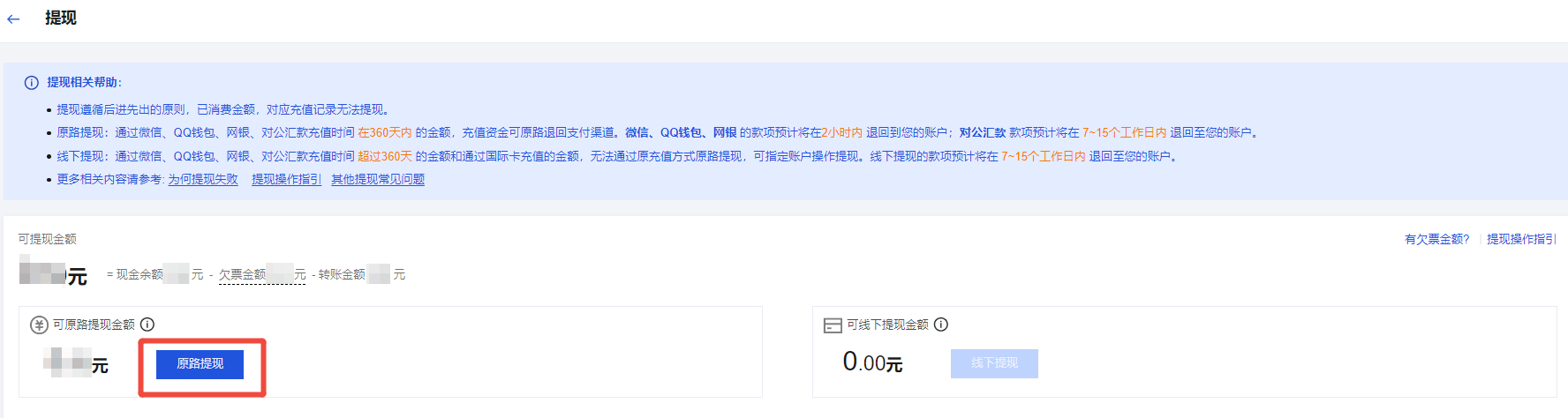 原路提现包括微信、QQ 钱包、网银、国际卡线上充值的提现,对公汇款充值的提现。申请提现后,按照后进先出的原则退回至您的充值账户,即后充值的现金金额优先提现。
