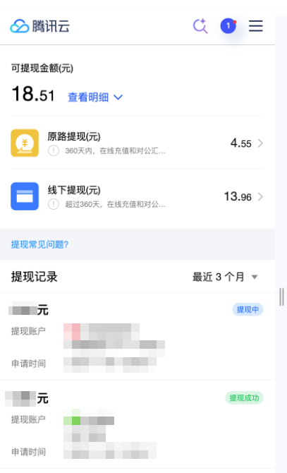 4. 对已经申请提现的操作记录,您可以在微信小程序【腾讯云助手】> 我的 > 余额 > 提现 > 提现记录列表中查看和确认状态。