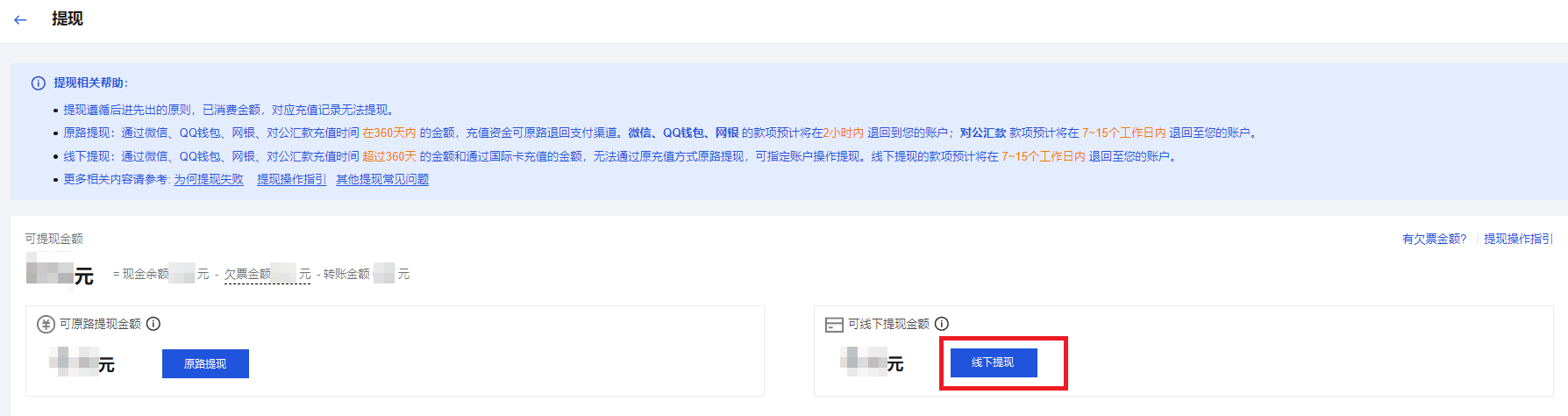 除原路提现外,您也可通过实名认证同名的银行卡来线下提现。通过微信、QQ钱包、网银、线下对公汇款进行充值的订单,超过360天,可以线下提现。