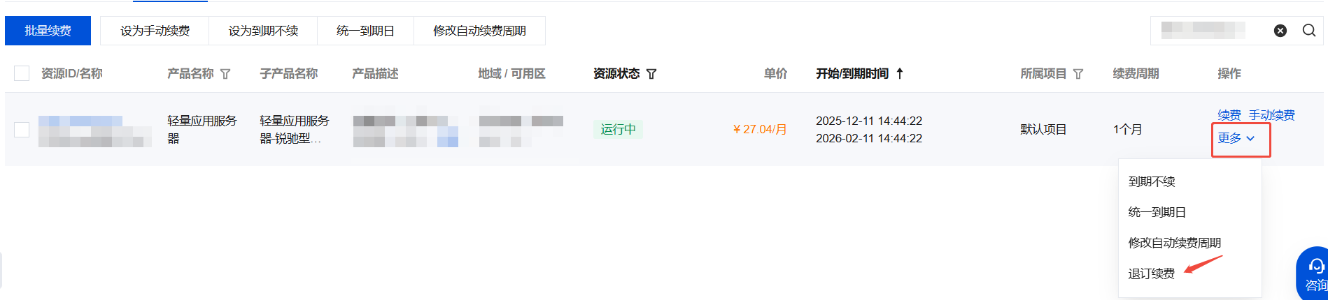 2. 在手动续费项和自动续费项中找到对应的资源列表,单击右侧操作栏的更多 > 退订续费。