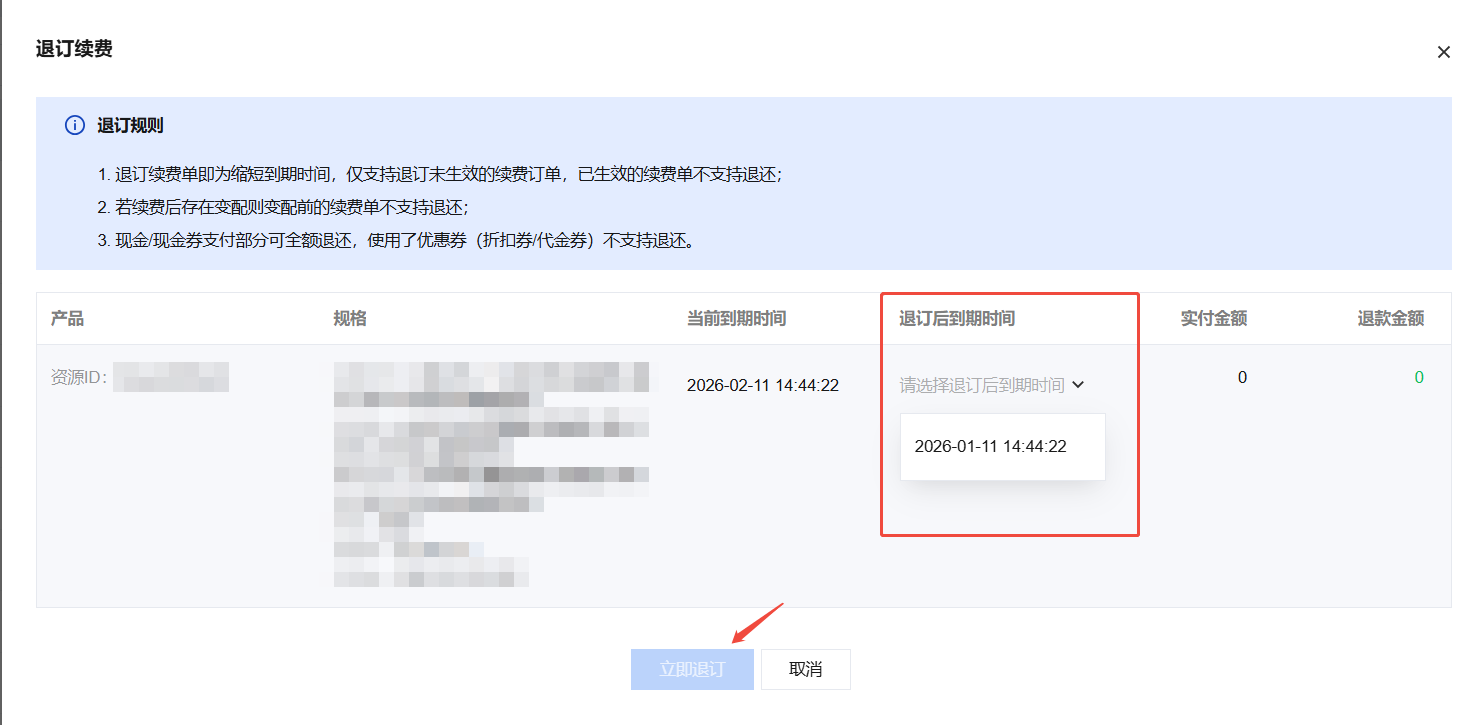3. 在弹出的窗口中,核对需要退订续费订单的资源,选择退订的到期时间,单击立即退订即可完成。目前仅支持退订最近的一笔续费单,若对同一个资源下了多笔续费单,需要依次退订。