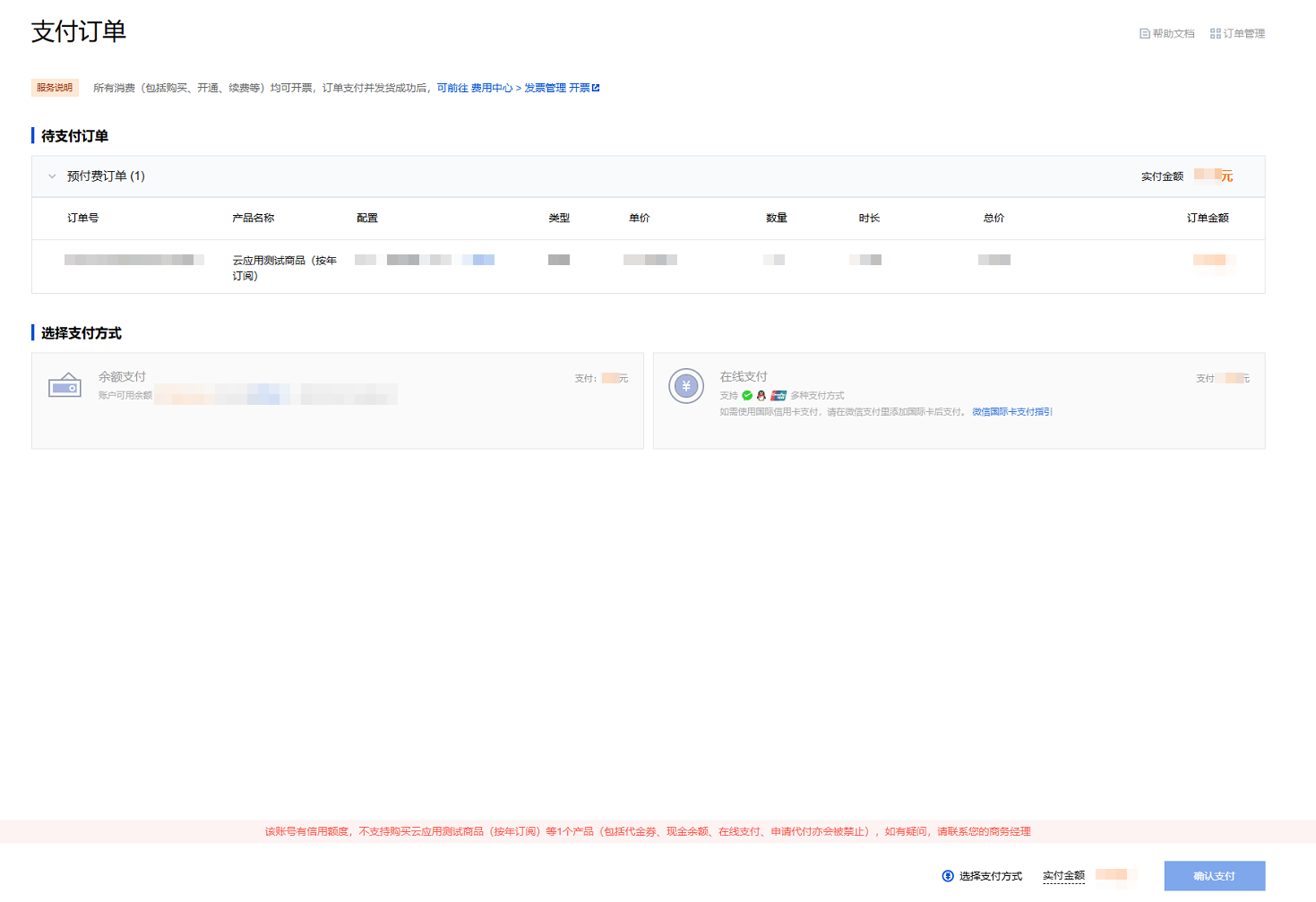 针对包年包月产品下单后的支付环节,会显示可用额度。