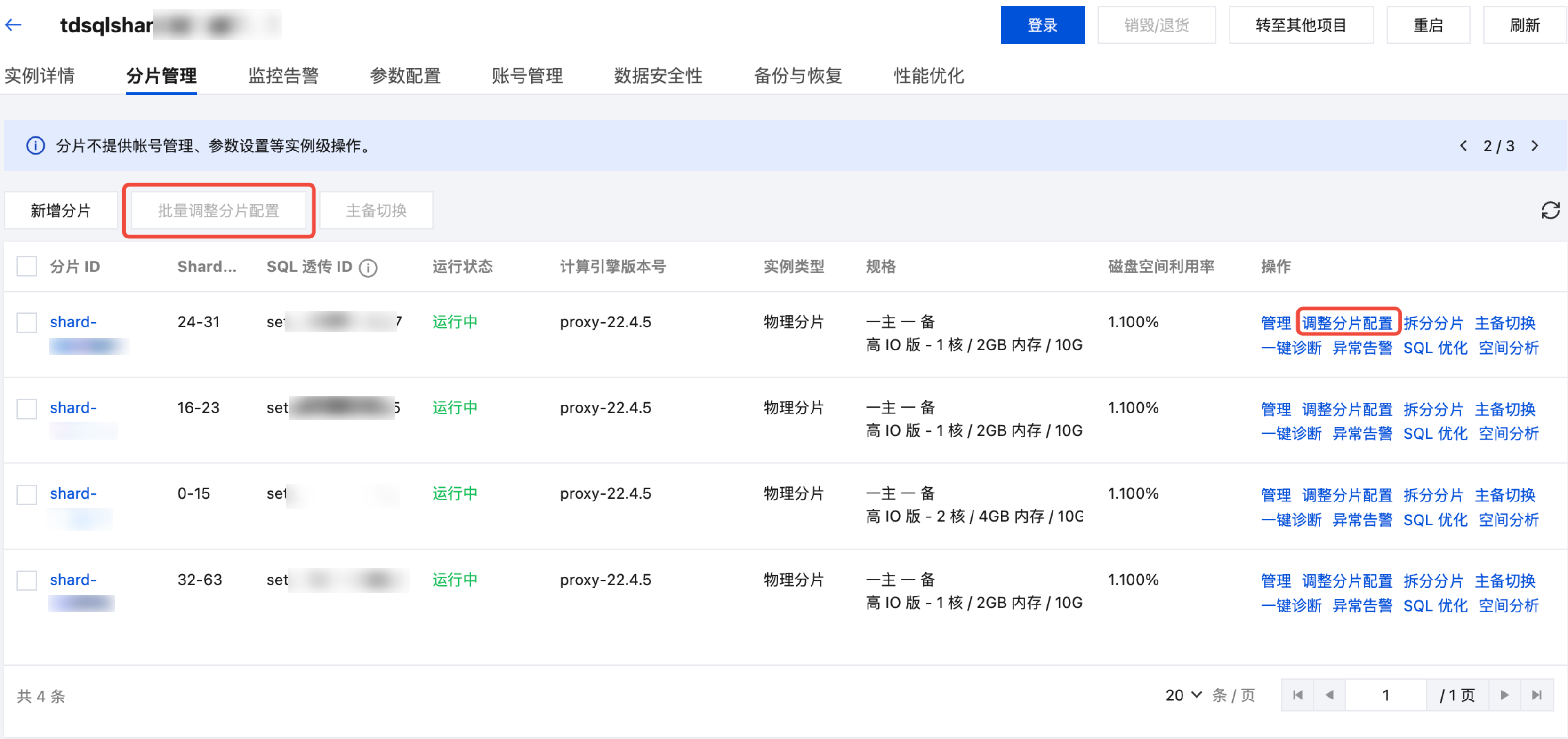 3. 在分片管理页中,选择分片后单击调整分片配置 ,选择所需规格、磁盘容量和指定时间进行切换。