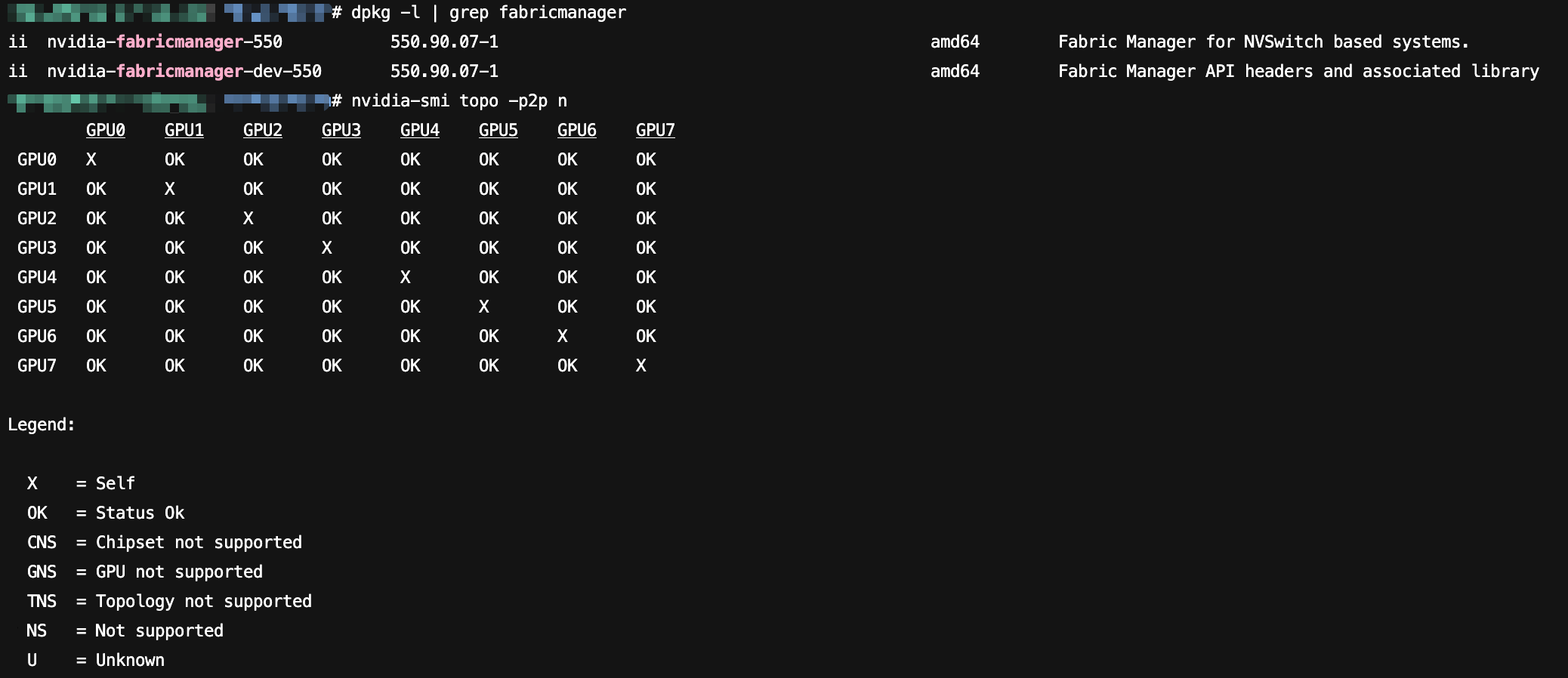 # 检查 NVIDIA Fabric Manager 版本信息dpkg -l | grep fabricmanager# 验证多 GPU 间的互连状态nvidia-smi topo -p2p n