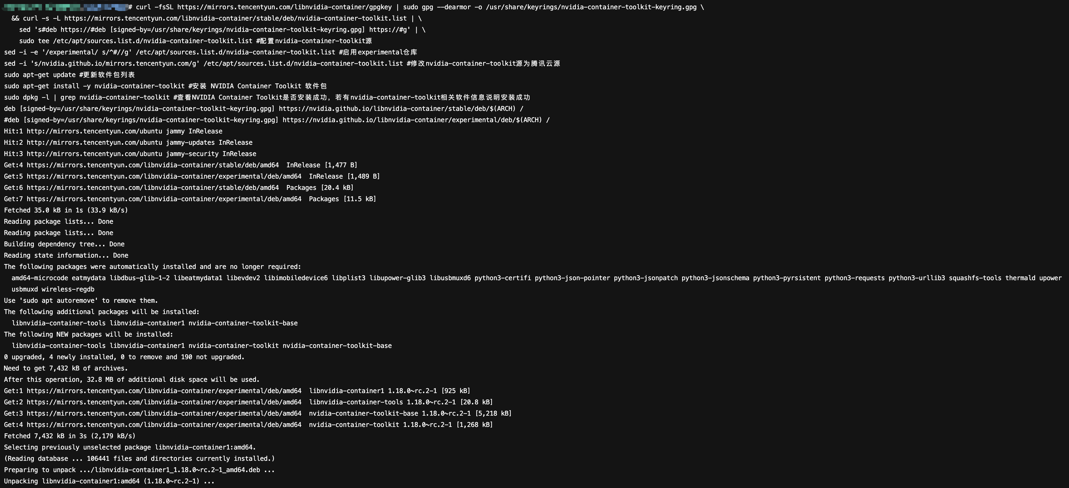 # 配置 nvidia-container-toolkit 源curl -fsSL https://mirrors.tencentyun.com/libnvidia-container/gpgkey | sudo gpg --dearmor -o /usr/share/keyrings/nvidia-container-toolkit-keyring.gpg \\&& curl -s -L https://mirrors.tencentyun.com/libnvidia-container/stable/deb/nvidia-container-toolkit.list | \\sed 's#deb https://#deb [signed-by=/usr/share/keyrings/nvidia-container-toolkit-keyring.gpg] https://#g' | \\sudo tee /etc/apt/sources.list.d/nvidia-container-toolkit.list# 启用 experimental 仓库sed -i -e '/experimental/ s/^#//g' /etc/apt/sources.list.d/nvidia-container-toolkit.list# 修改 nvidia-container-toolkit 源为腾讯云源sed -i 's/nvidia.github.io/mirrors.tencentyun.com/g' /etc/apt/sources.list.d/nvidia-container-toolkit.list# 更新软件包列表sudo apt-get update# 安装 NVIDIA Container Toolkit 软件包sudo apt-get install -y nvidia-container-toolkit# 查看NVIDIA Container Toolkit是否安装成功,若有nvidia-container-toolkit相关软件信息说明安装成功sudo dpkg -l | grep nvidia-container-toolkit# 重启docker使NVIDIA Container Toolkit生效sudo systemctl restart docker