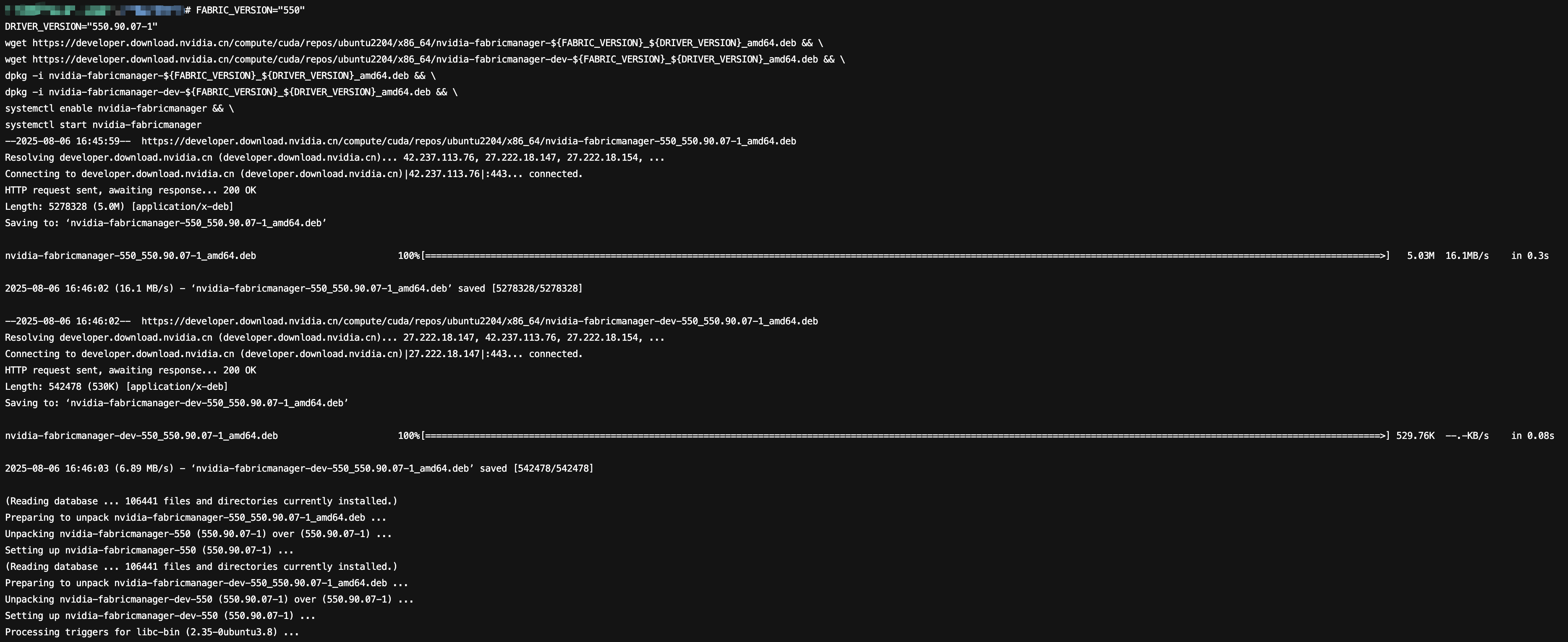 # 设置主版本号FABRIC_VERSION="550"# 设置完整的驱动版本号(包含子版本和修订号)DRIVER_VERSION="550.90.07-1"# 下载主安装包wget https://developer.download.nvidia.cn/compute/cuda/repos/ubuntu2204/x86_64/nvidia-fabricmanager-${FABRIC_VERSION}_${DRIVER_VERSION}_amd64.deb && \\# 下载开发包wget https://developer.download.nvidia.cn/compute/cuda/repos/ubuntu2204/x86_64/nvidia-fabricmanager-dev-${FABRIC_VERSION}_${DRIVER_VERSION}_amd64.deb && \\# 安装主包dpkg -i nvidia-fabricmanager-${FABRIC_VERSION}_${DRIVER_VERSION}_amd64.deb && \\# 安装开发包dpkg -i nvidia-fabricmanager-dev-${FABRIC_VERSION}_${DRIVER_VERSION}_amd64.deb && \\# 启用系统服务systemctl enable nvidia-fabricmanager && \\# 立即启动服务systemctl start nvidia-fabricmanager