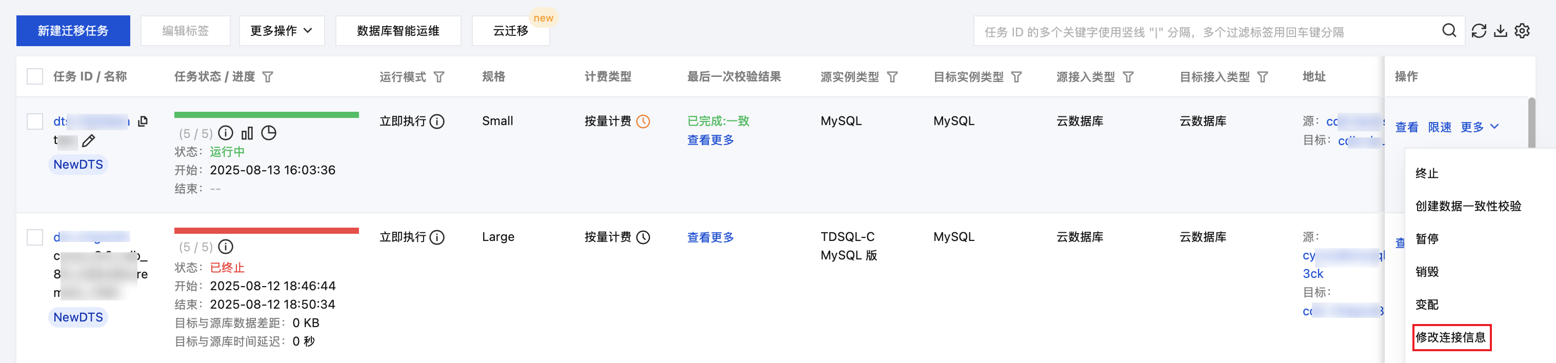 3. 迁移任务的任务状态为“运行中/准备完成/任务出错”时,支持修改连接信息。