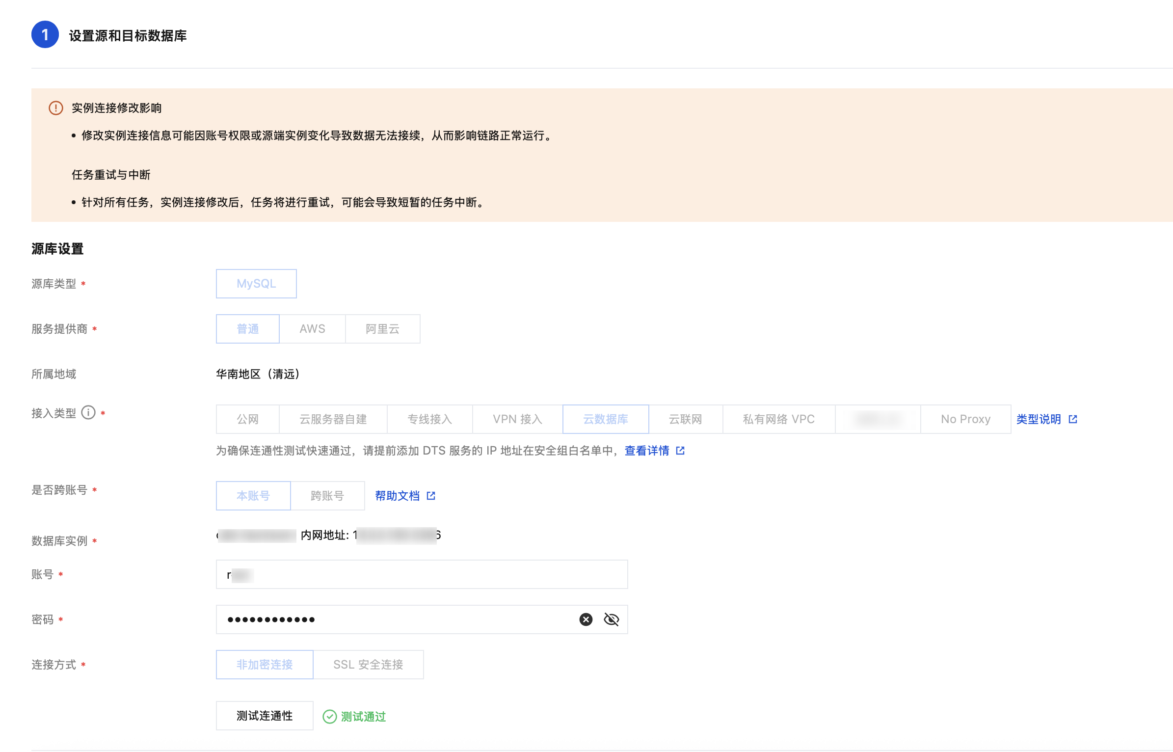 1. 修改实例连接信息可能因账号权限或源端实例变化导致数据无法接续,从而影响链路正常运行。