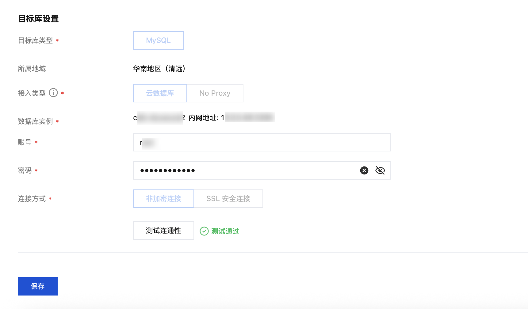 2. 在设置源和目标数据库页面,根据实际需求修改源库和目标库相关参数,如主机地址、端口、账号、密码等,测试连通性后,单击保存。
