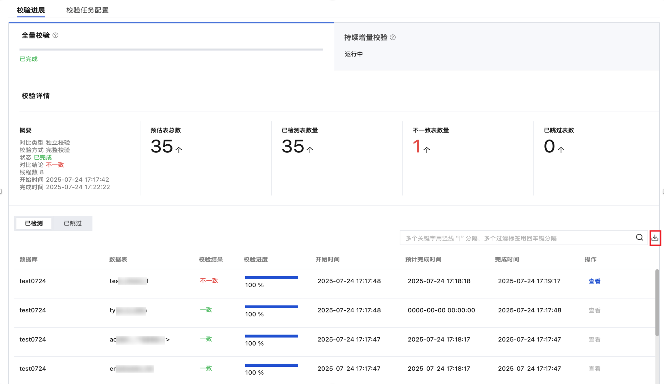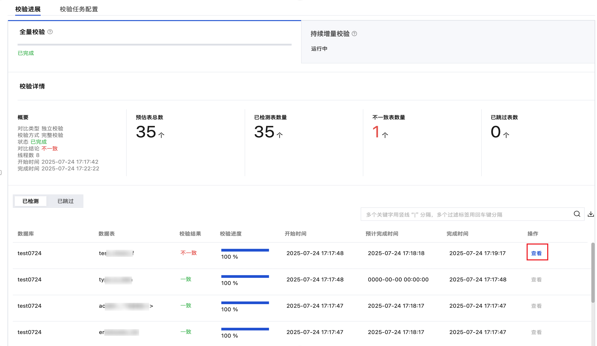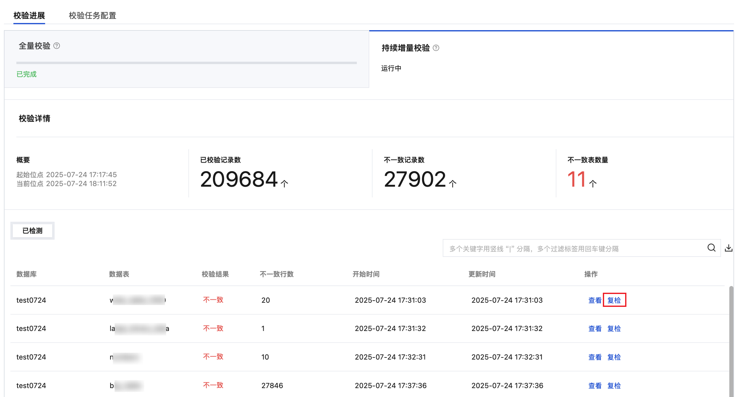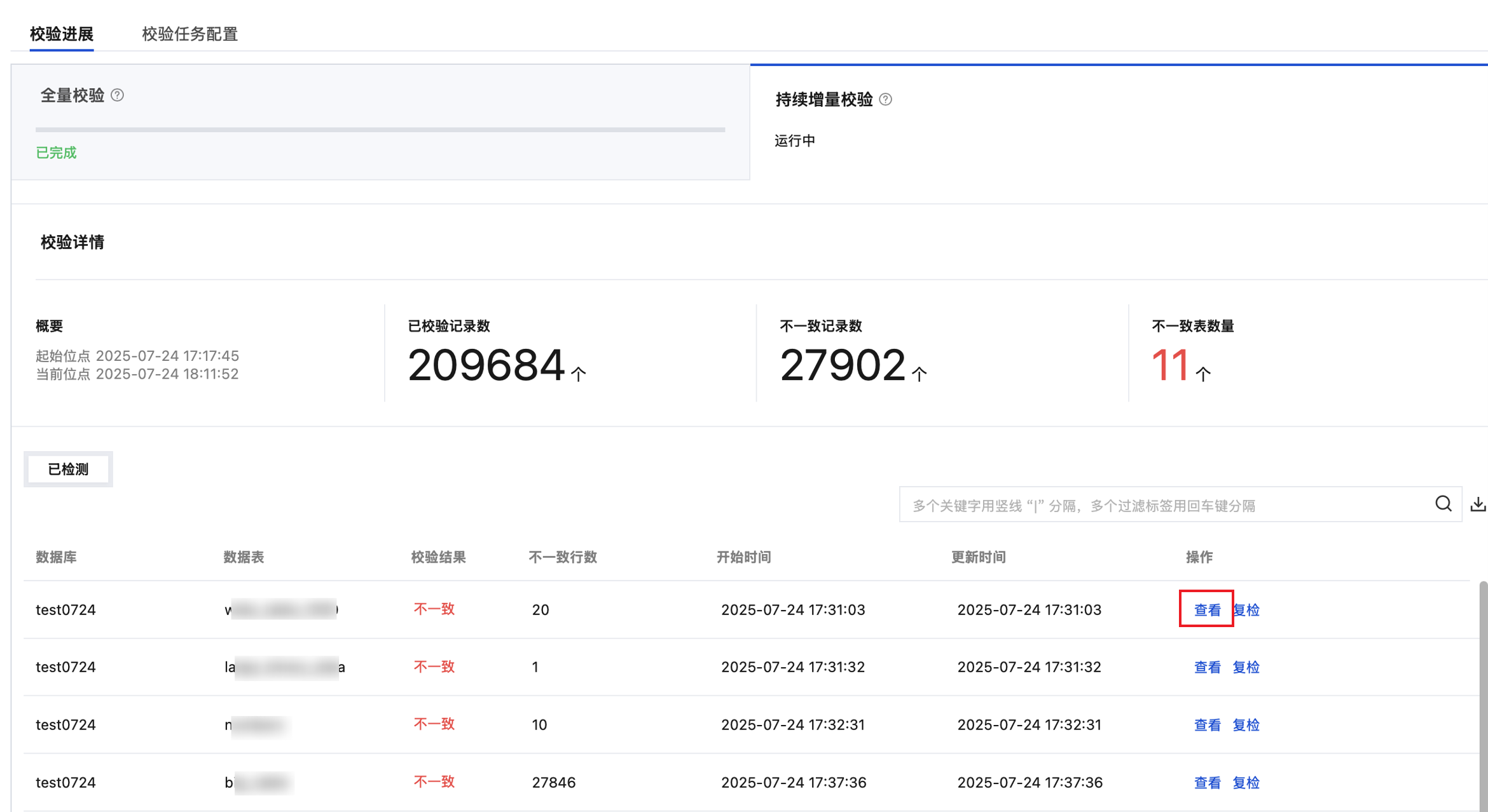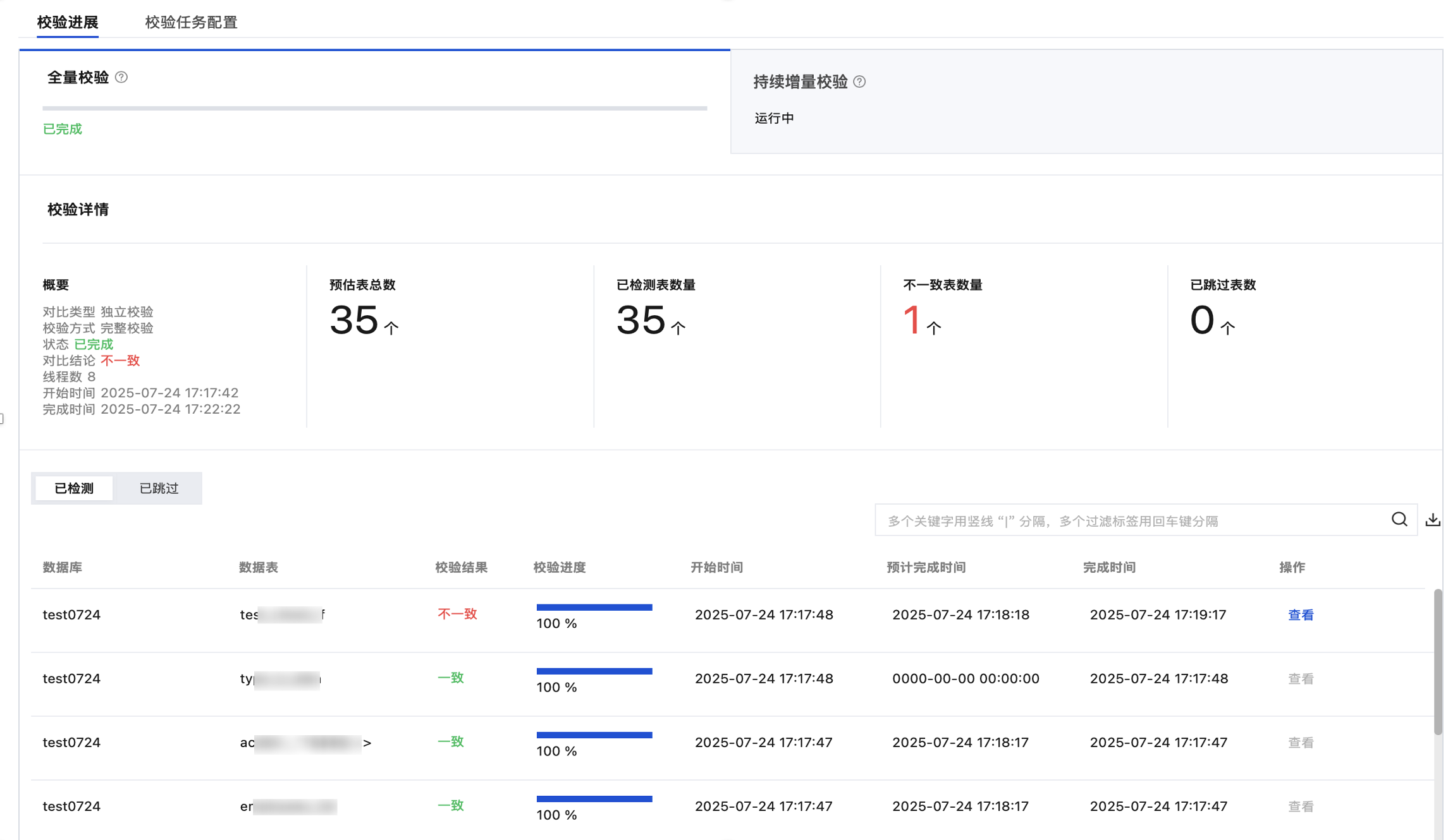 持续增量校验:查看已校验记录数、不一致记录数、不一致表数量。