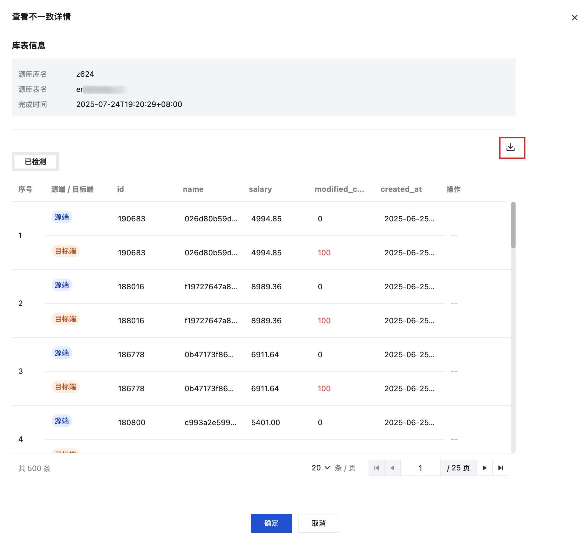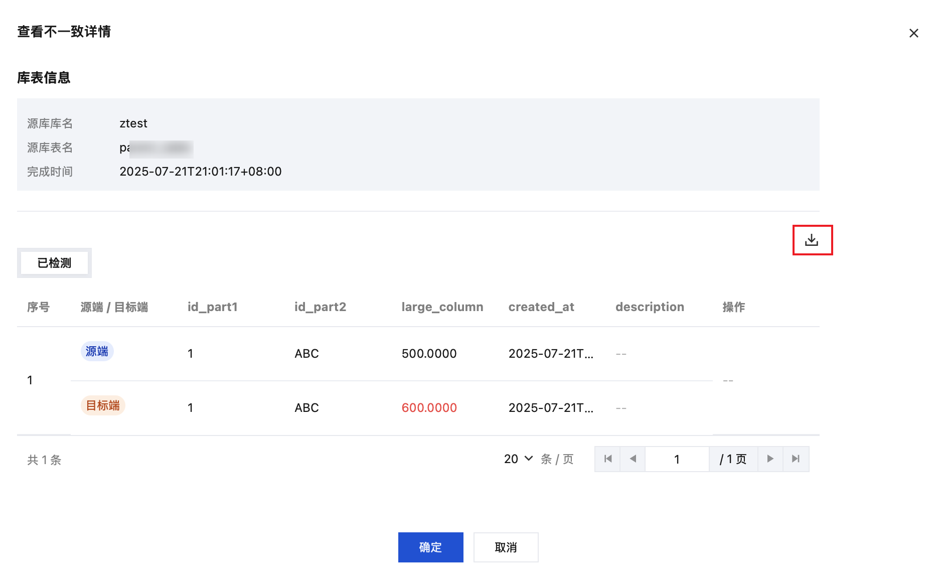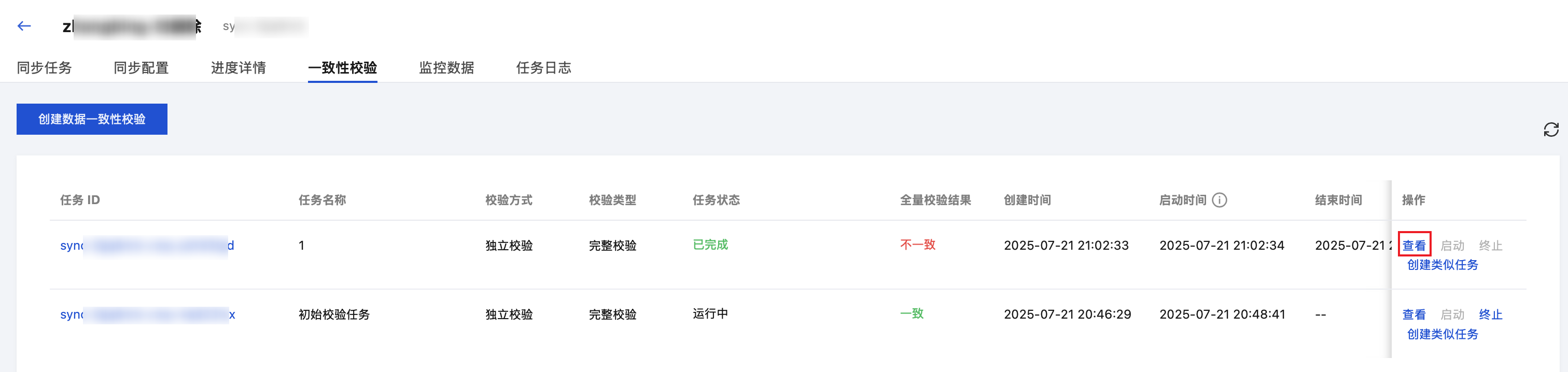 1. 在一致性校验页面,单击查看,即可查看校验结果。